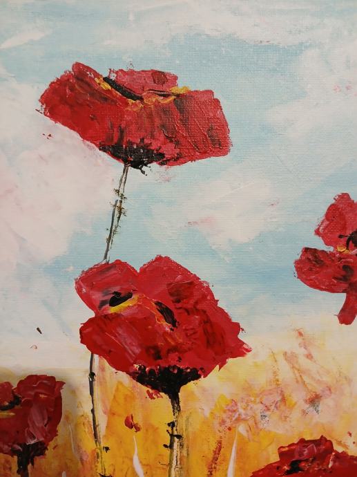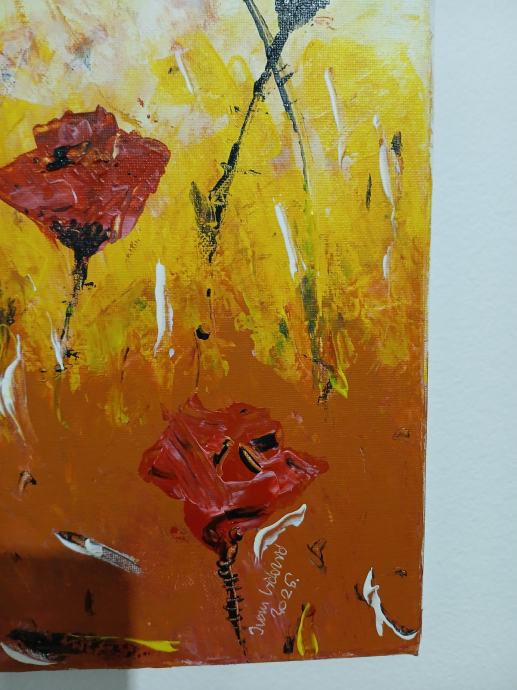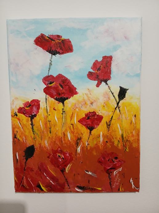 Slika je motiv makova u žitu, rađeno na platnu koristeći akrilne boje i isključivo slikarsku špahtlu, za poseban efekt.