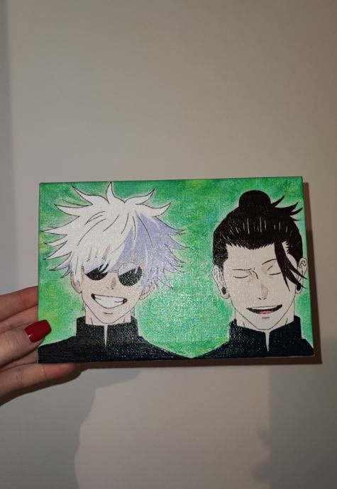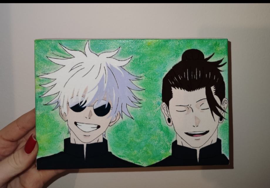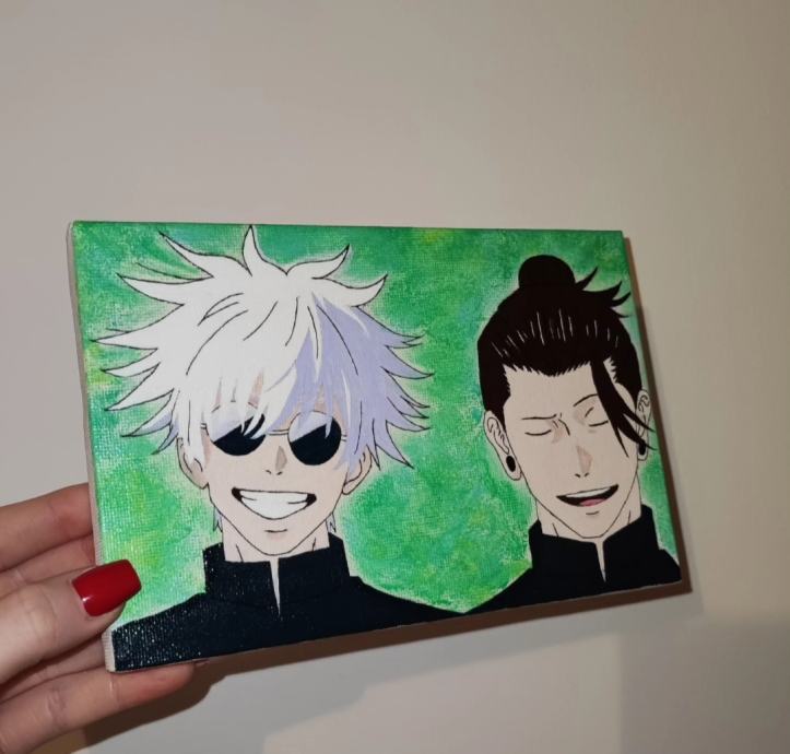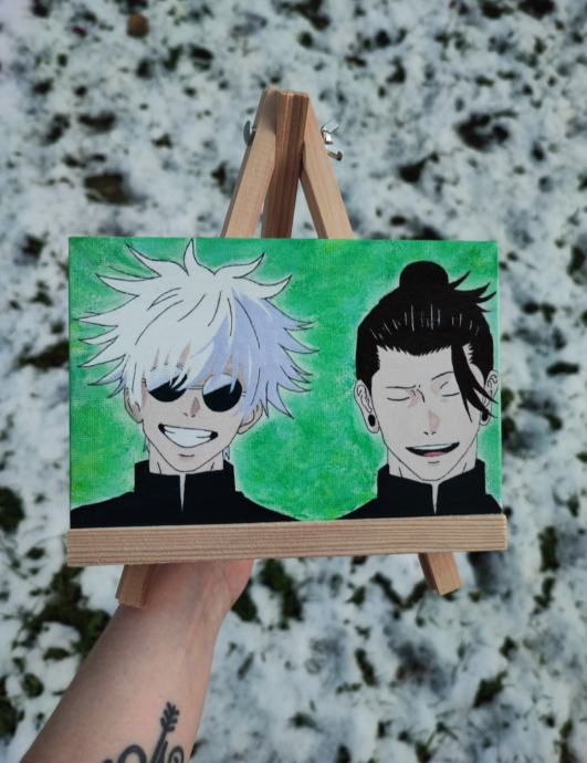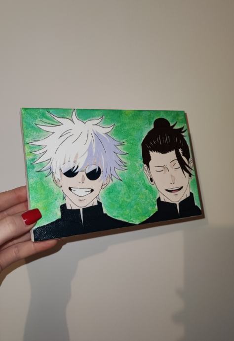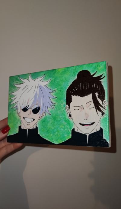 Ručno rađena slika na platnu sa akrilnim bojama. Na slici se nalaze Gojo i Geto iz svjetski poznatog animea Jujutsu Kaisen. Sa slikom dolazi i stalak. Veličina slike je 18x24cm. Slika je premazana sa zaštitnim sjajnim završnim slojem koji je vodootporan, štiti boje te se na sliku ne lijepi prašina. Mogu poslati putem box now ili pošte, ali trošak poštarine snosi kupac. Možete mi poslati i poruku na WhatsApp za više informacija :)