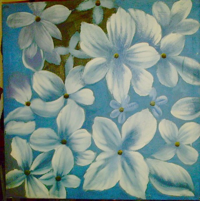 slika" PLAVA SLIKA" bijeli cvjetovi na plavoj podlozi djeluju vrlo dekorativno. Ulje na platnu.