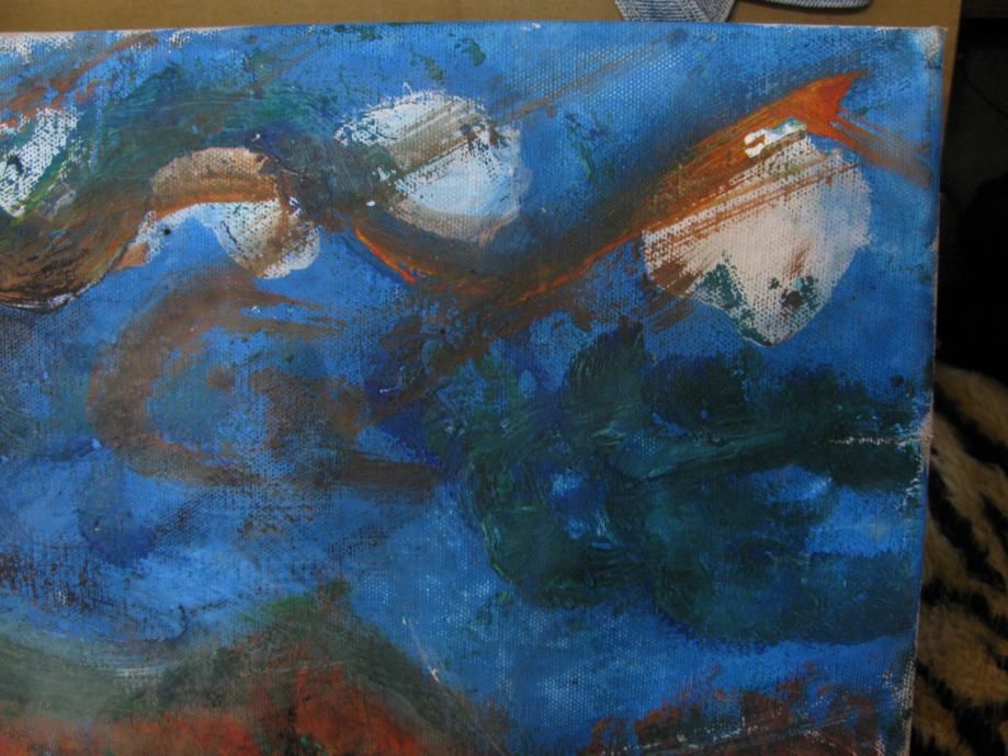 Na desnoj strani uz sami rub oštečeno platno (vidi sliku 4).Smeđa mrlja na pozadini od boje.