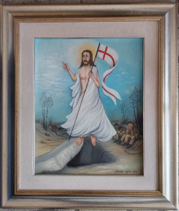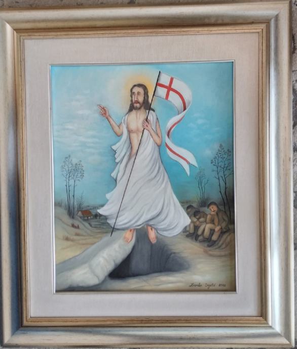 Slikar naivne umjetnosti. Slika Isusa je velika, uramljena, dimenzija 65x75cm. Tehnika ulje na platnu. God 2002.