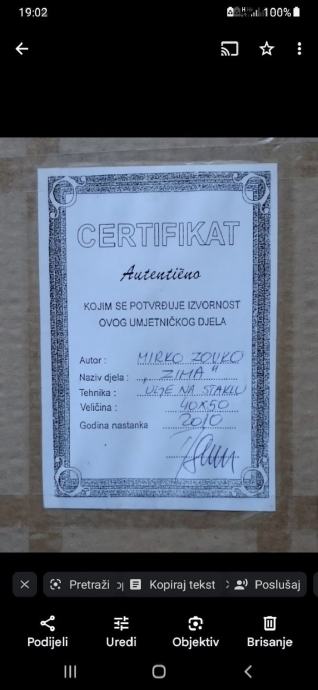 Uramljena slika, tehika ulje na staklu. Ima certifikat. Slikar Mirko Zovko. Dimenzija cijele slike sa ramom 58x55cm