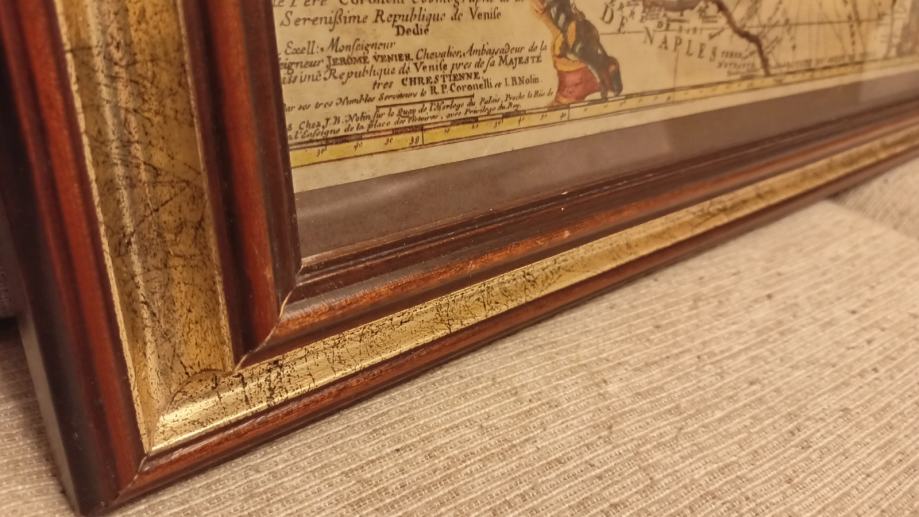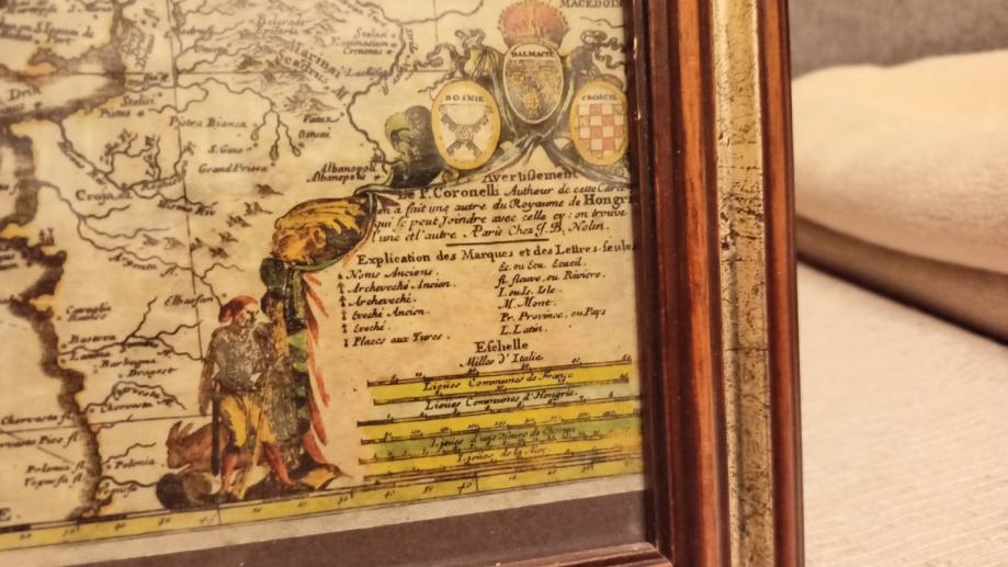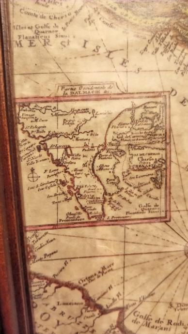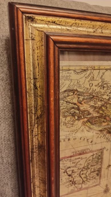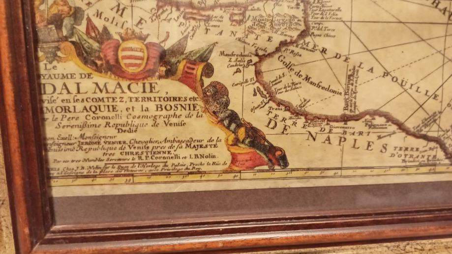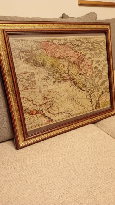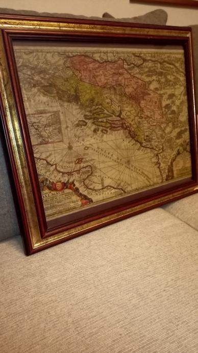 Slika na papirusu, stara karta Hrvatske, Bosne, Jadransko more, otoci, iz 17. stoljeća, uokvirena u predivan masivni drveni okvir. Predivan ukras na zidu sa daškom davne povijesti. Dimenzije 51x43x3,5 cm. Cijena 550,00 kn. Molim nazvati na mob. 091/2356157