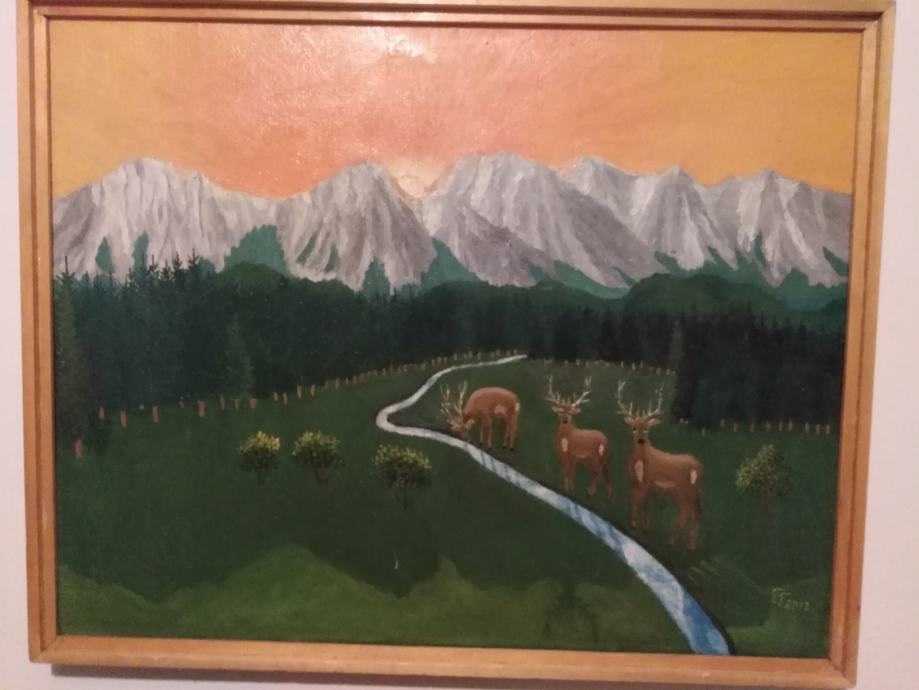 Planinski pejzaž. Tehnika- ulje na platnu Dimenzije s drvenim okvirom 72 cm x 57 cm. Umjetnik Franjo Toma - samouki slikar.