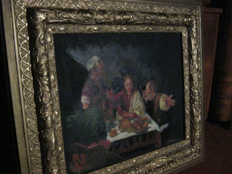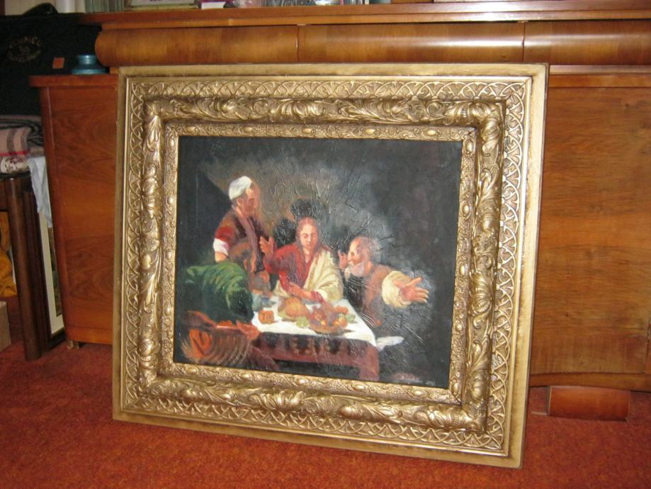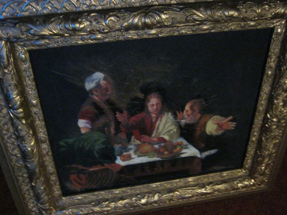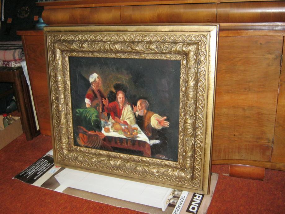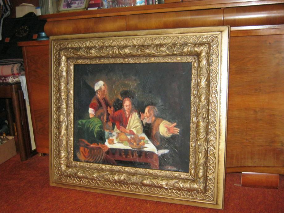 Caravaggiove " Večere u Emausu " . Uramljeno u masivnoj , bogatoj i restauriranoj staroj rami ,