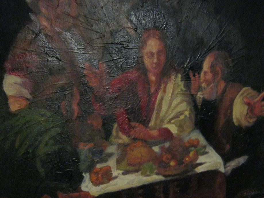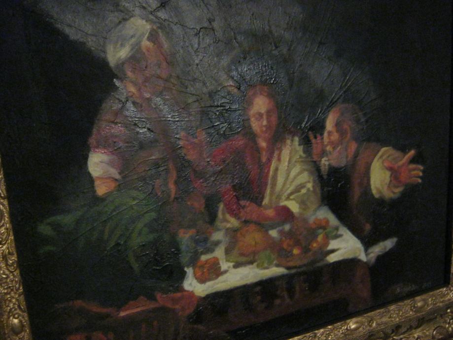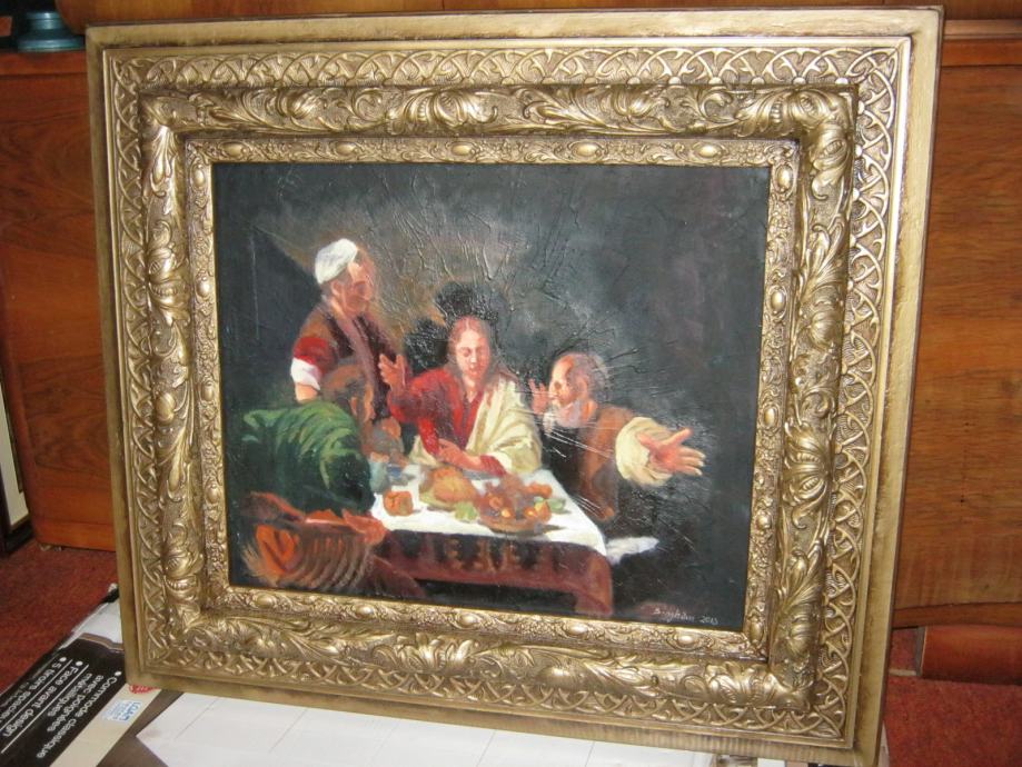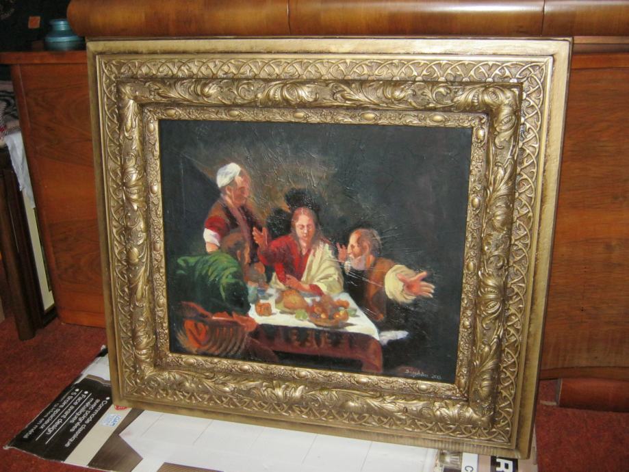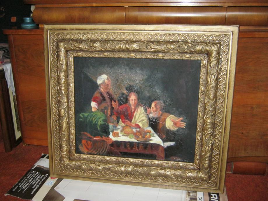 Caravaggiove " Večere u Emausu " . Uramljeno u masivnoj , bogatoj i restauriranoj staroj rami ,