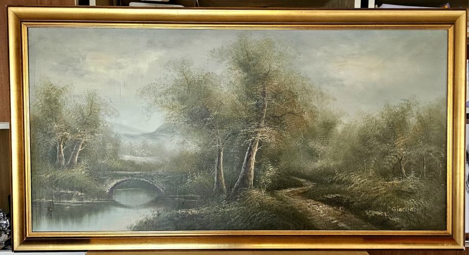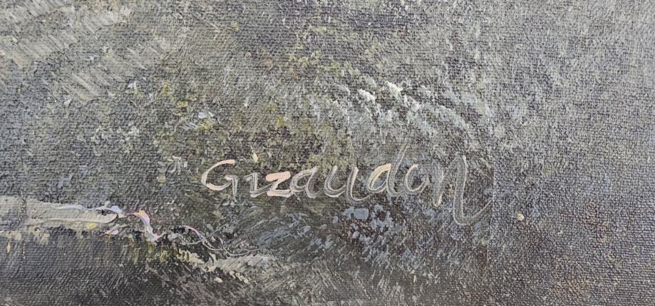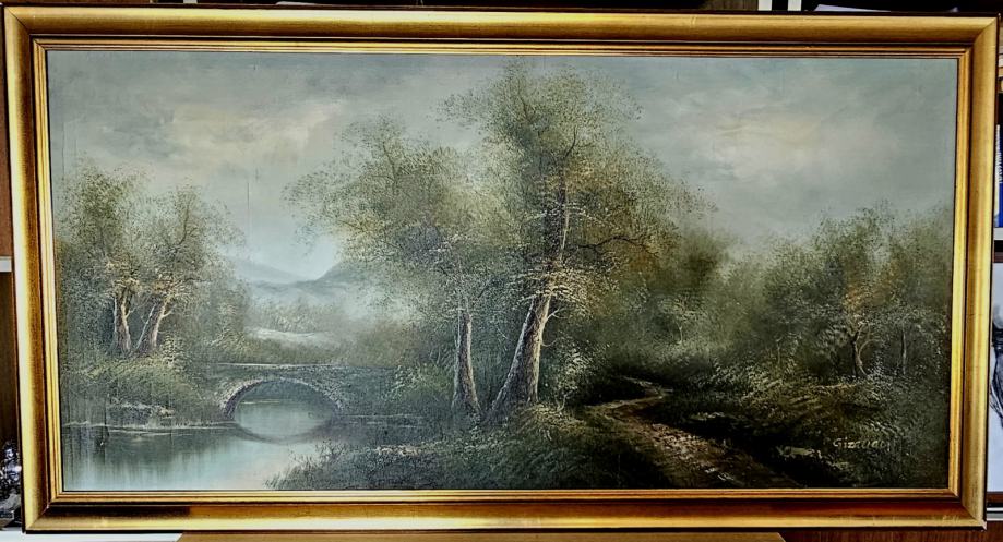 Impozantna slika velikog formata na platnu, Gizaudon, velikog formata ( 138 x 74 cm ), uokvirena u zlatnom okviru 7 cm debline/širine.