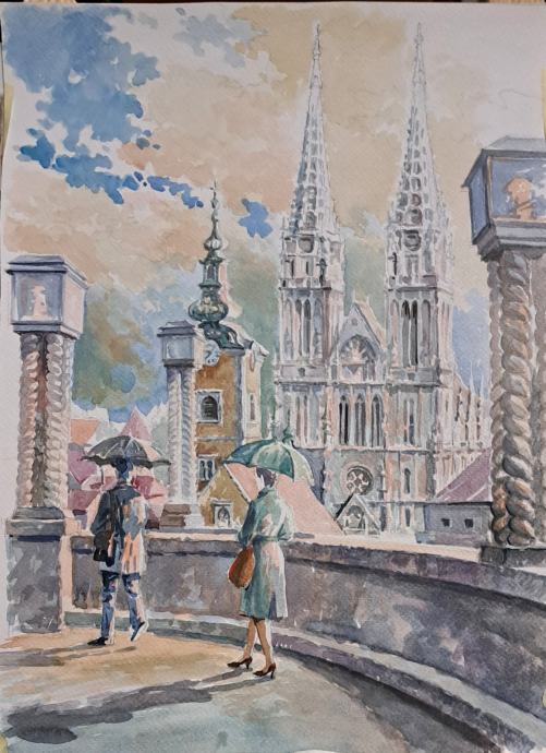 Slika: Zagreb, pogled na katedralu, dim: V40 Š30 cm, tehnika Akvarel