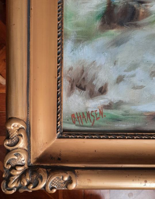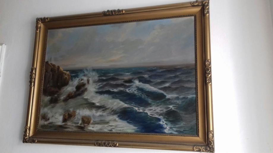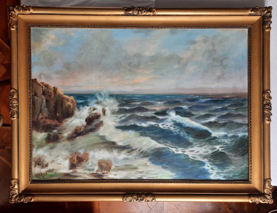 OIL ON CANVAS, "SEA AND COASTAL SCENE". SIGNED LOWER LEFT. GOOD CONDITION. 20" x 16" IN FRAME.