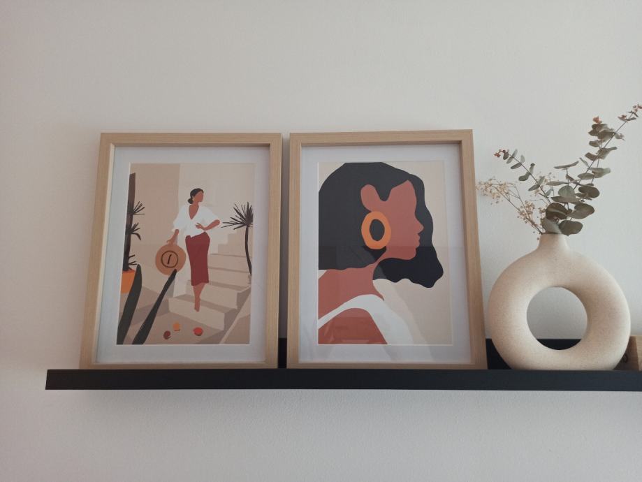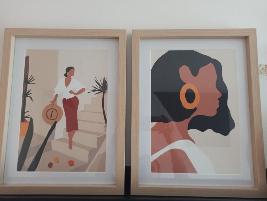 Prodaju se dva printa s apstraktnom zenskom figurom. U cijenu ukljuceni drveni okviri sa staklom. Dimenzije jednog okvira su 43x33 cm.