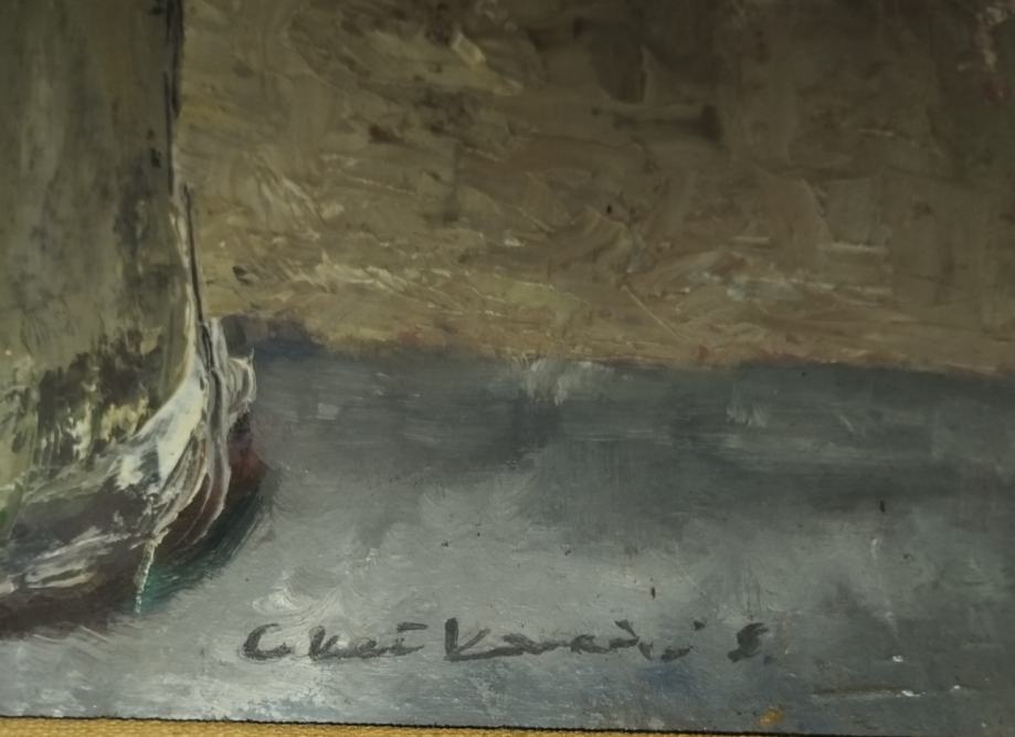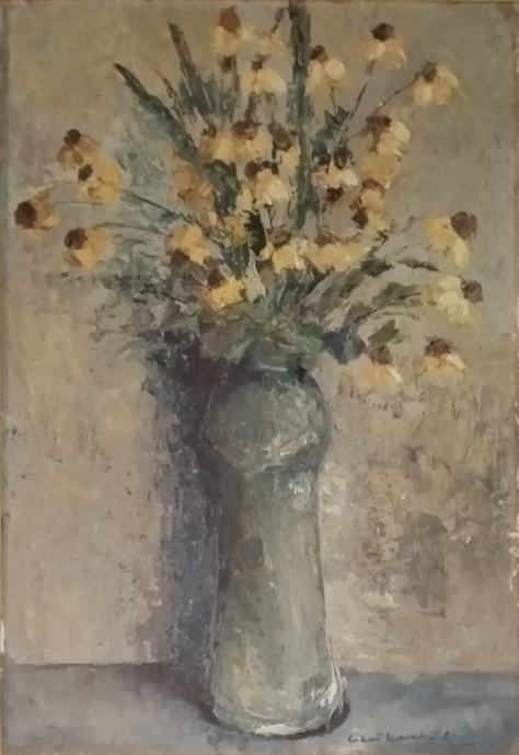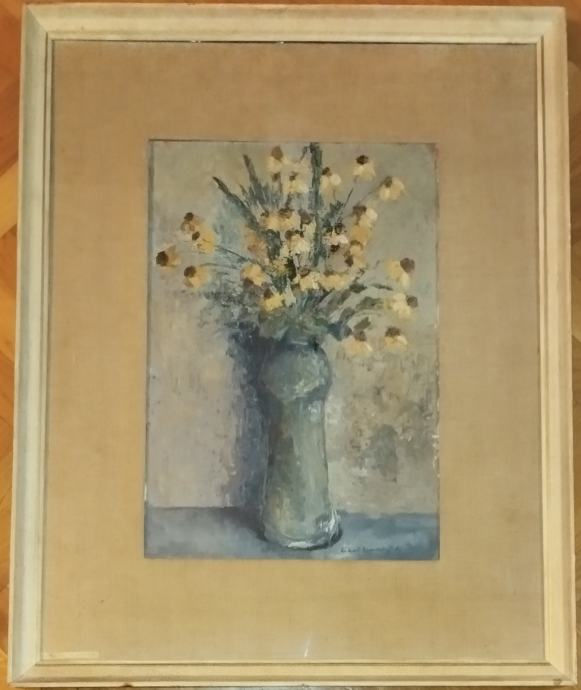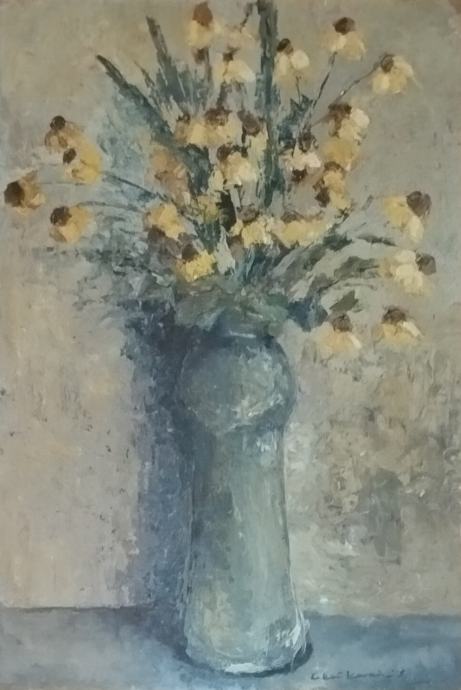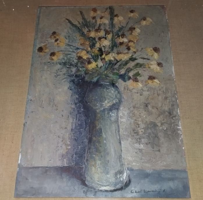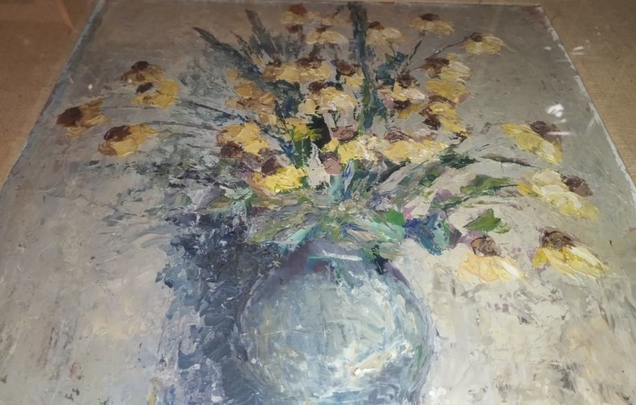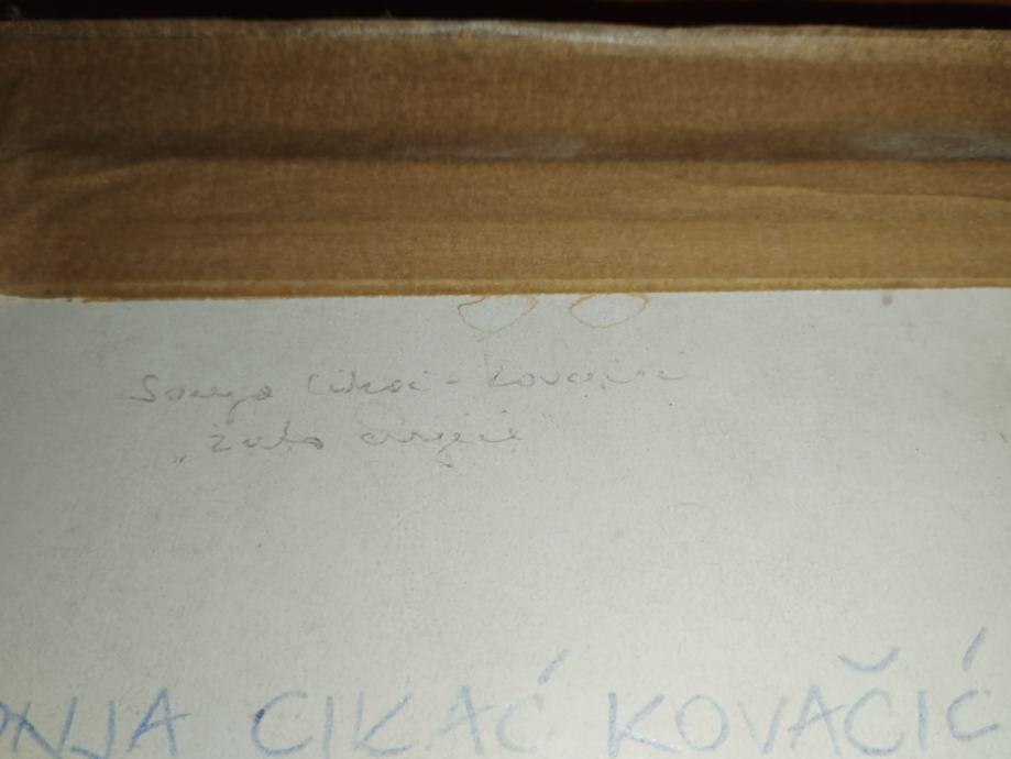 Ulje na lesonitu hrvatske akademske slikarice Sonje Cikač Kovačić. Naziv slike je "Žuto cvijeće". Galerijski uramljeno u stari okvir s paspartuom i ostakljeno. Dimenzije s okvirom 80x64cm (sama slika 50x34cm).