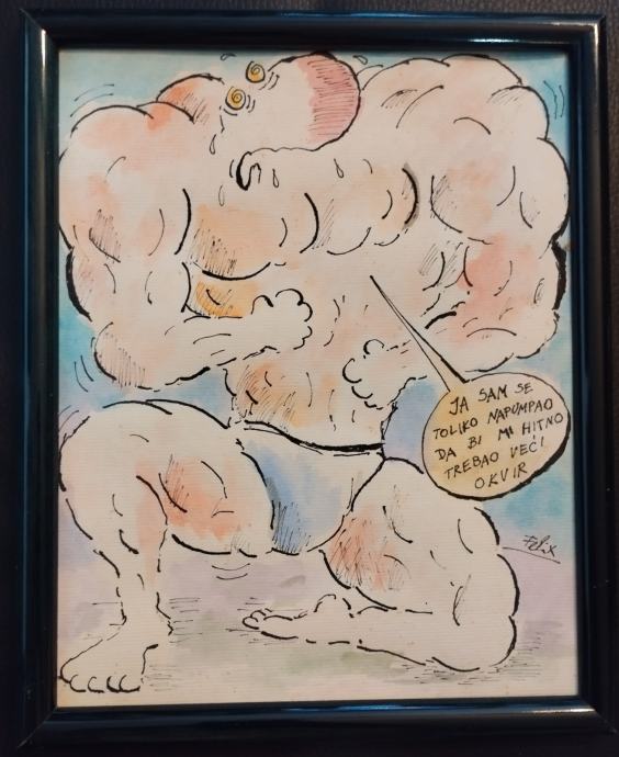 Crtež poznatog hrvatskog majstora karikatura Srećka Puntarića Felixa. Motiv je bodybuilder. Dimenzije s okvirom 27x22cm. Nema stakla.