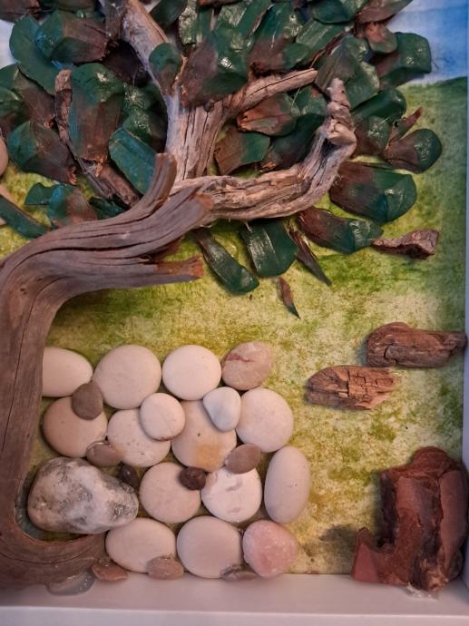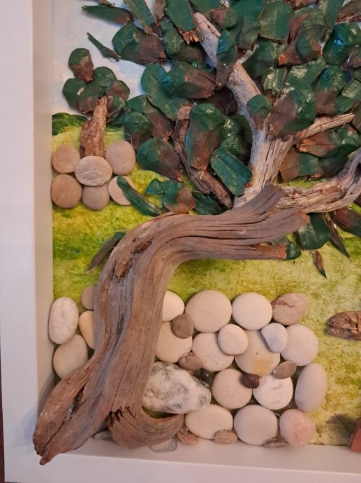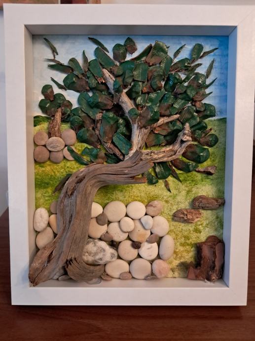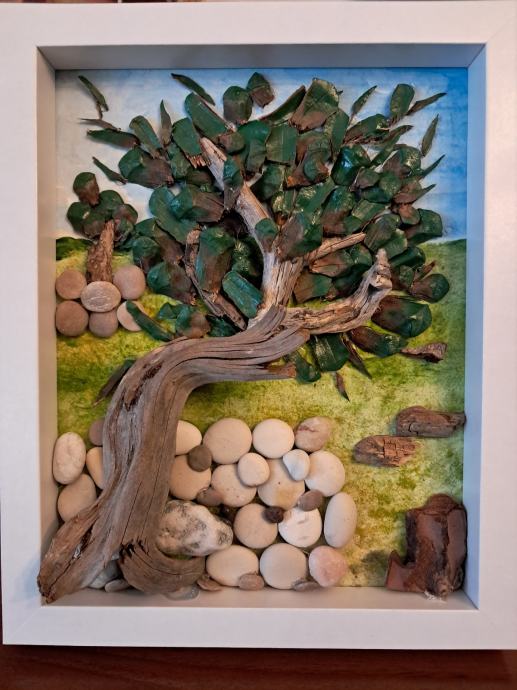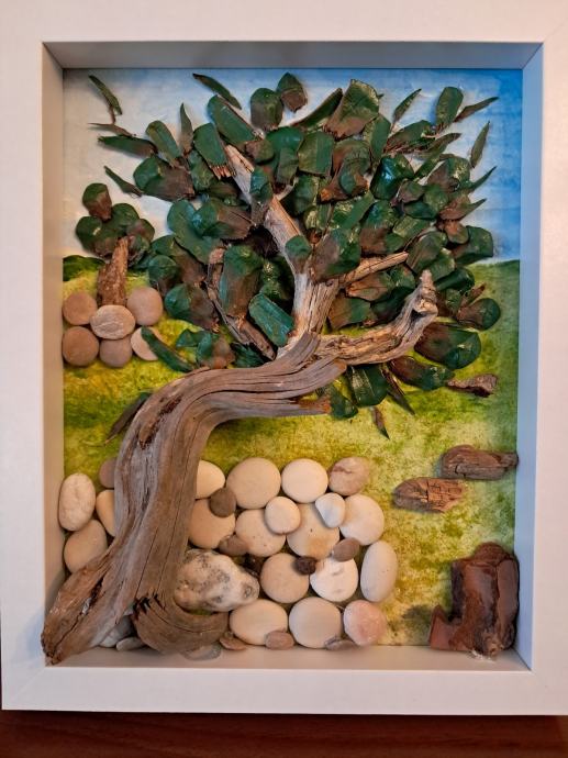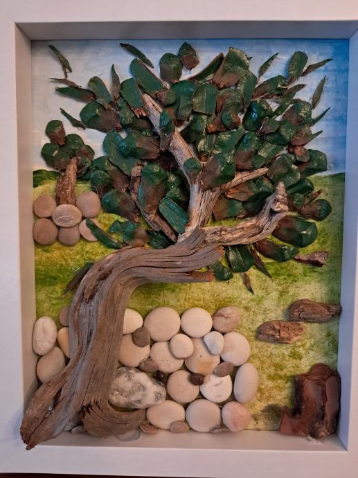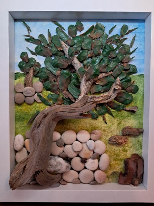 Ova lijepa slika izrađena je od komada morskih naplavina, kamenčića sa plaže i obojana akrilnim bojama.Gledajući ovu sliku kao da čujemo šum masline na vjetru i miris mora u daljini.Dimenzija slike je 22,5 × 28 cm.