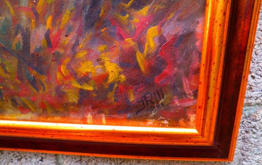 Autor Janez Rill. Slikar koji je zbog svojih hrvatskih uvjerenja u bivšoj Jugoslaviji bio proganjan i šikaniran,Slika je iz 1951 i dimenzija 85 x 67 cm zajedno sa okvirom.Okvir je potpuno nov i samo on je koštao 236 kuna.Slika ima jedno sitno mjesto gdje je otpala boja što sam i fotografirao da naknadno ne bi bilo problema (gotovo neznatno)