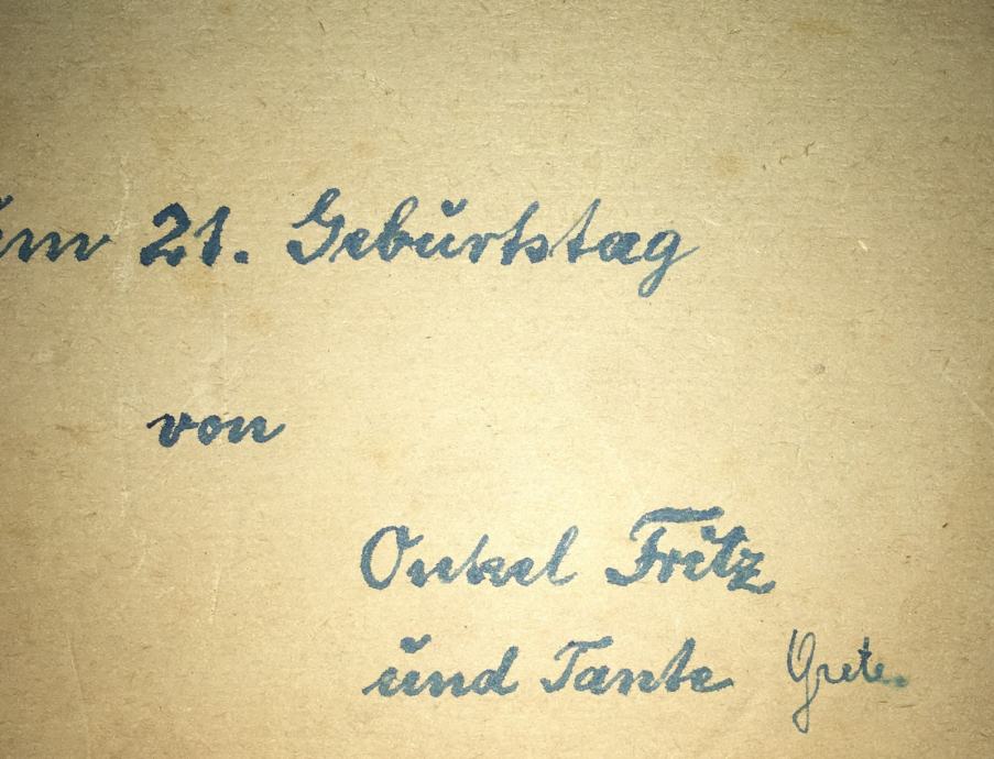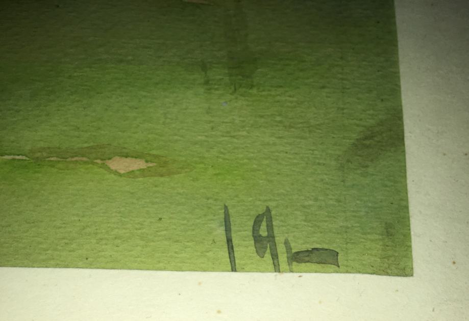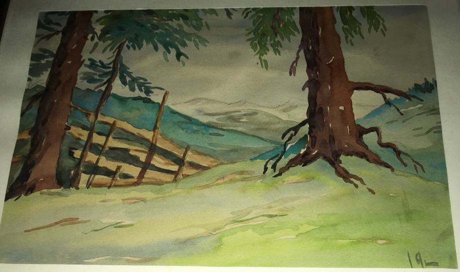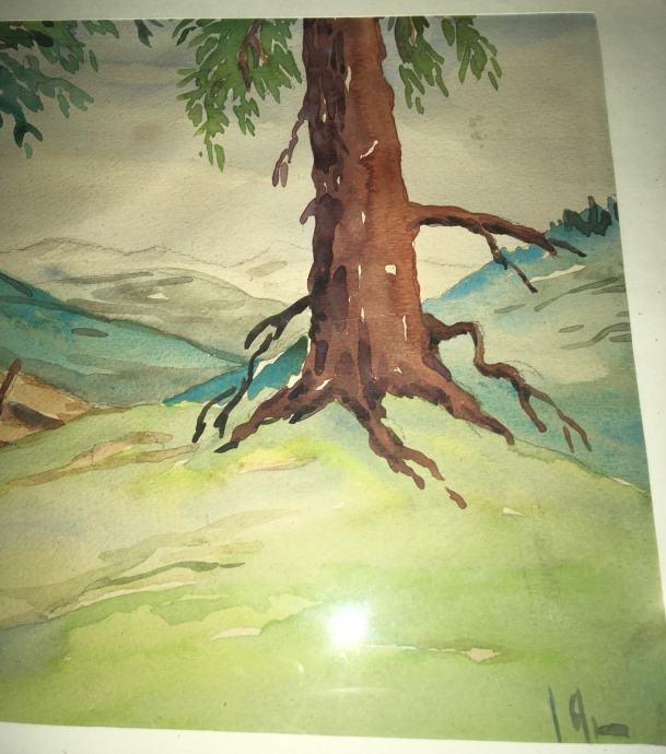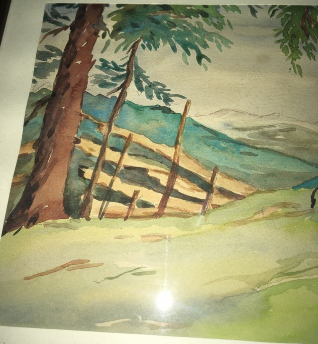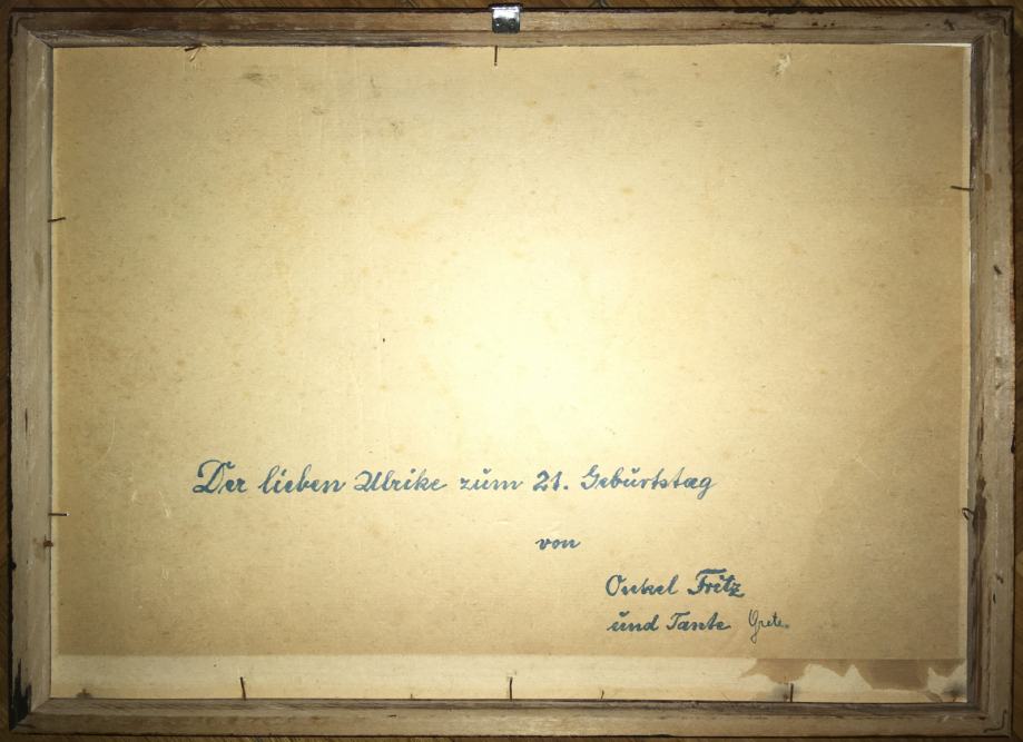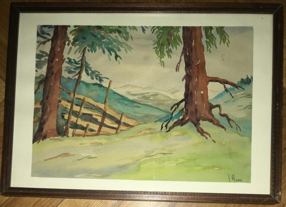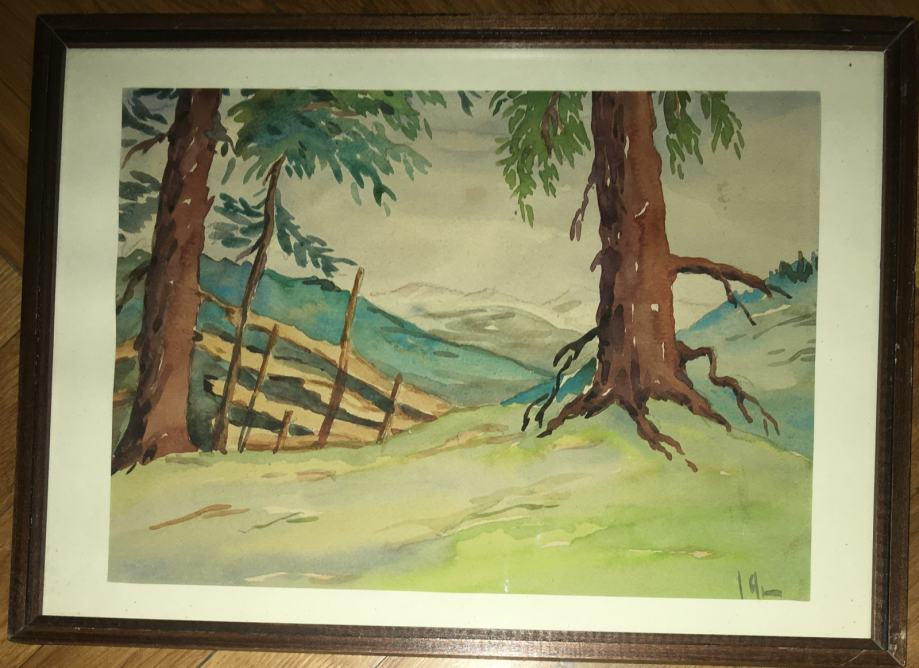 Akvarel meni nepoznatog autora (nečitko potpisano). Na tražnjoj strani posveta na njemačkom jeziku. Uokvireno i ostakljeno. Dimenzije s okvirom su 37x27cm (unutar paspartua 30x21cm).