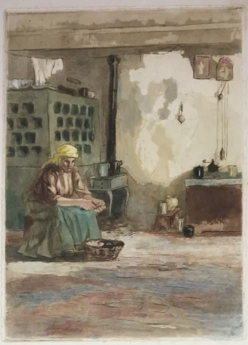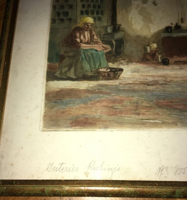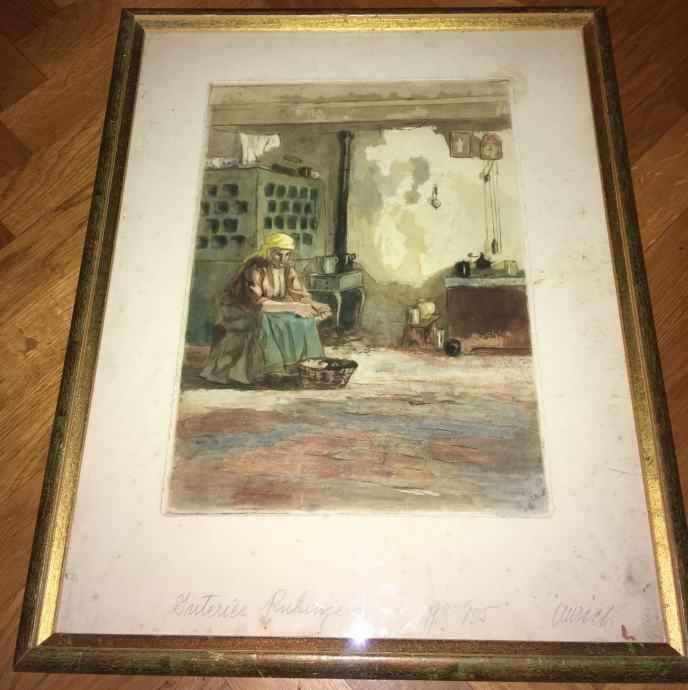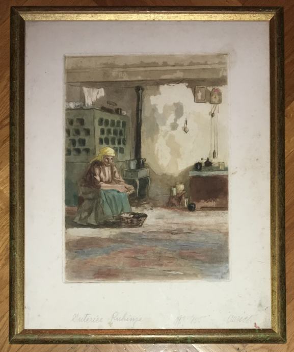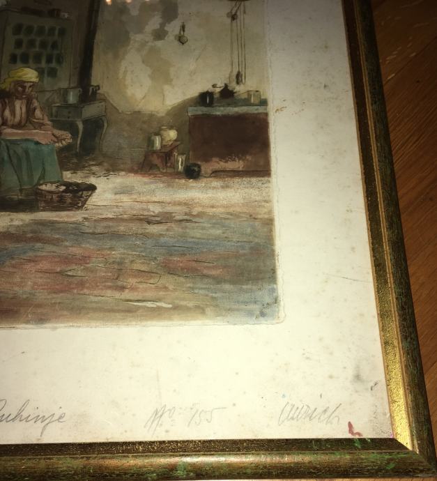 Izvrstan stari bakropis / aquatinta s motivom interijera kuhinje, potpisano (meni nepoznati autor). Uokvireno i ostakljeno. Dimenzije s okvirom 52x42cm.