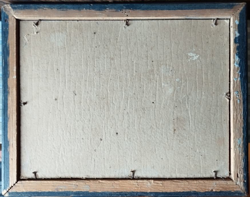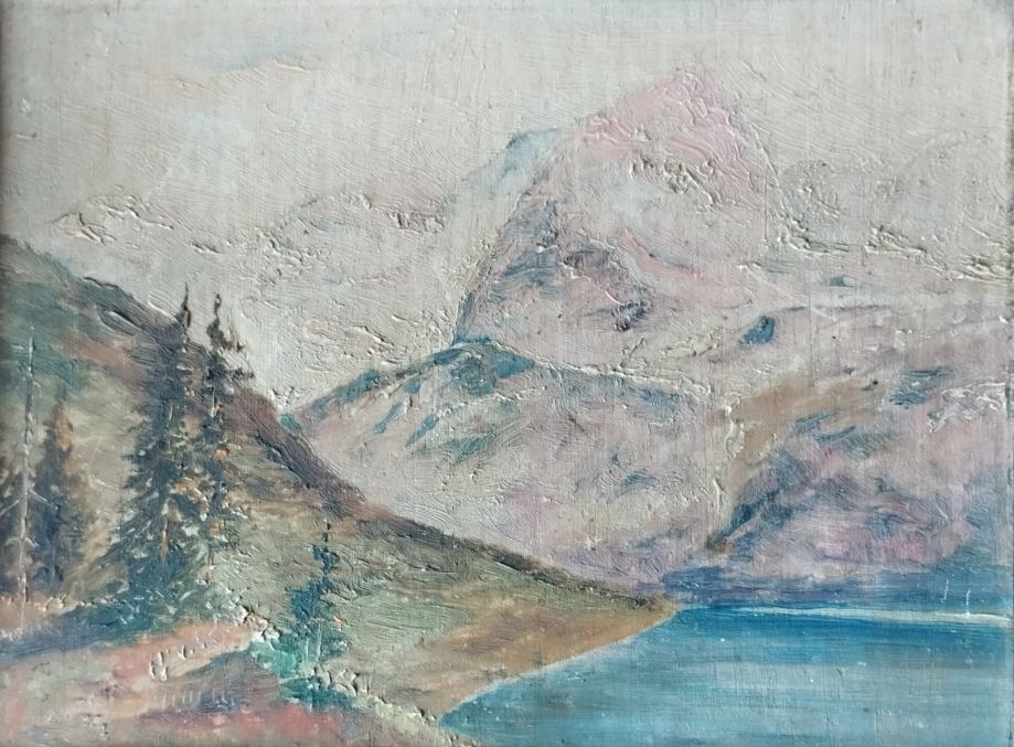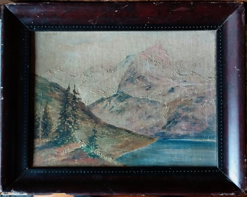 Staro ulje na kartonu, planinski pejzaž, dimenzije d okvirom 24x19cm. Nečitko potpisano.