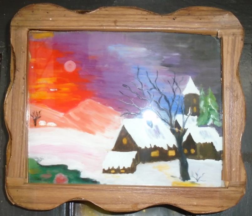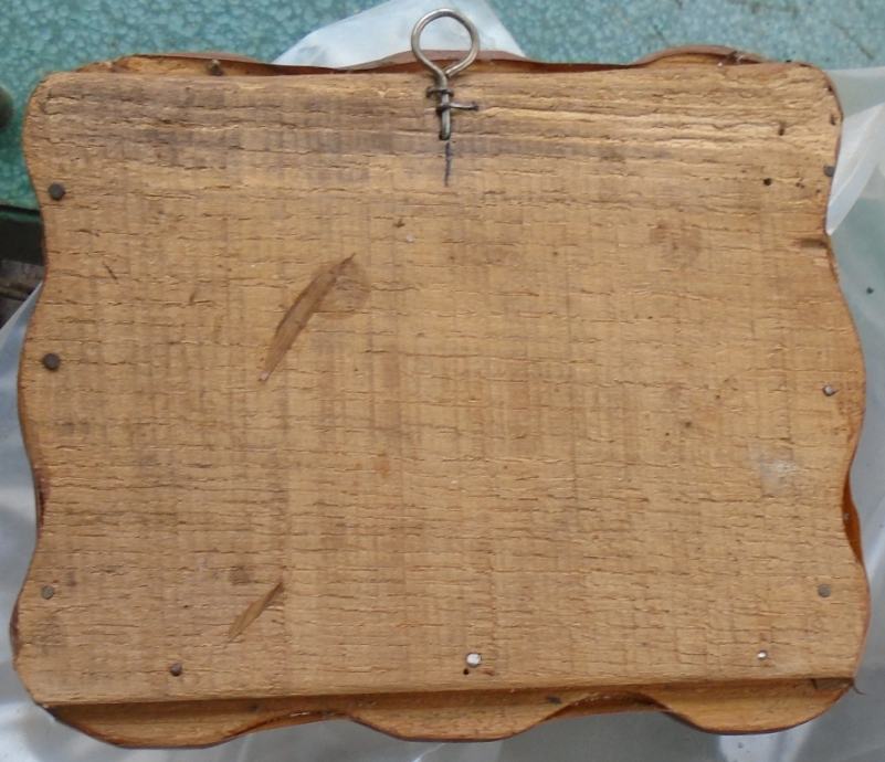 Dimenzije 15 x 12 cm,nepoznati autor.Slika je umetnuta u drveni okvir koji je obljepljen nekom trakom tako da izgleda kao da je furniran.