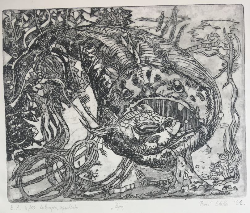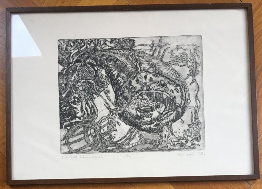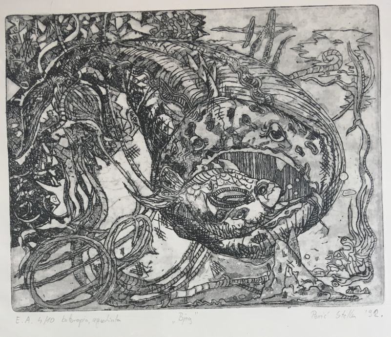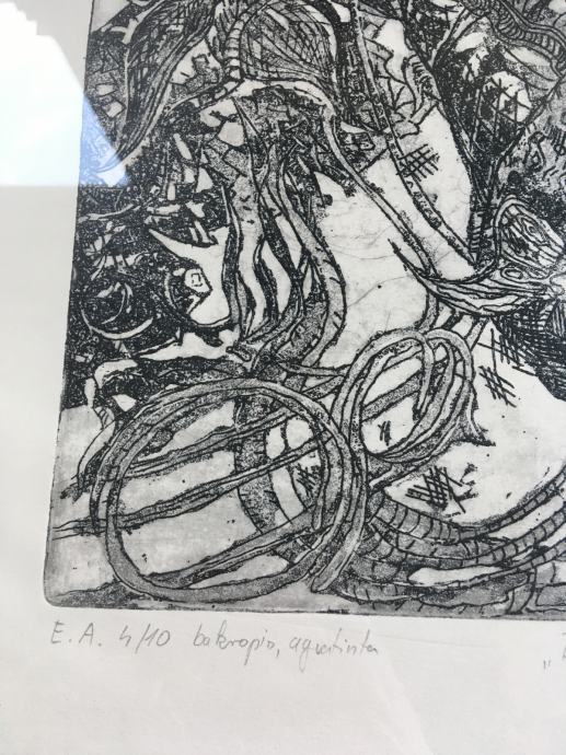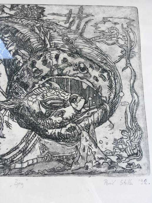 Bakopis iz 1992.g. hrvatske akademske slikarice i profesorice likovne kulture Stele Perić. Mala serija od samo 10 primjeraka. Galerijski uramljeno i ostakljeno. Dimenzije s okvirom su cca 51x36cm.
