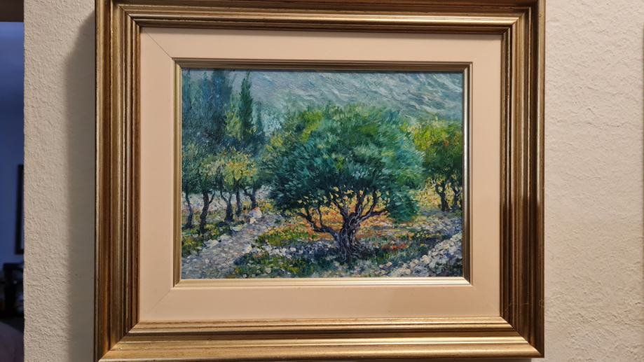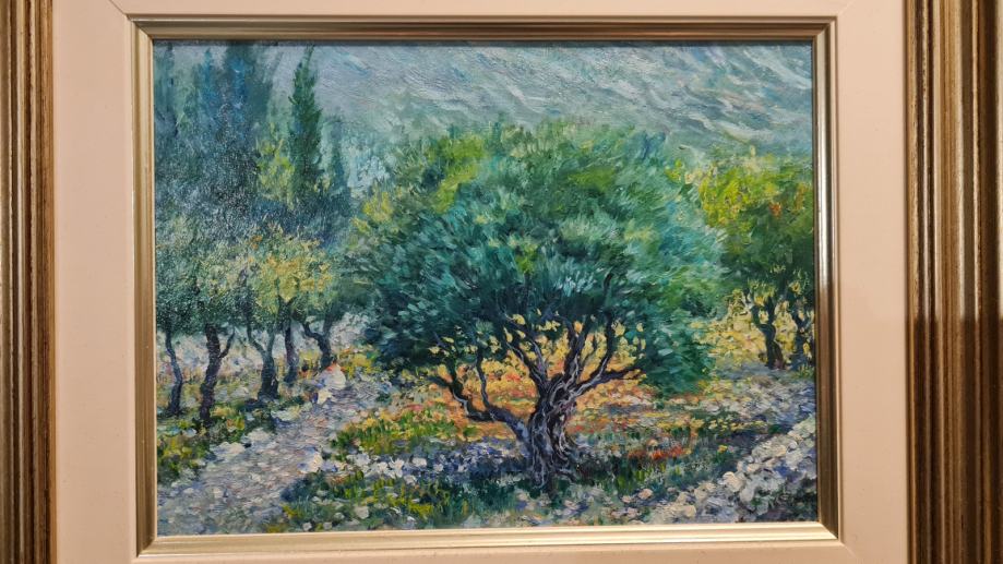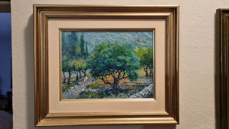 Slika prikazuje mirnu, spokojnu atmosferu šumske ceste koja vijuga kroz gustu šumu. Cesta je uska i krivudava, napravljena od grube, nabijene zemlje, a s obje strane je omeđena visokim, veličanstvenim drvećem. Njihovo lišće nježno šušti na povjetarcu, bacajući pjegave sjene na tlo ispod.