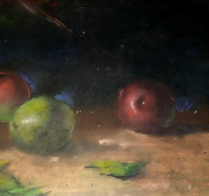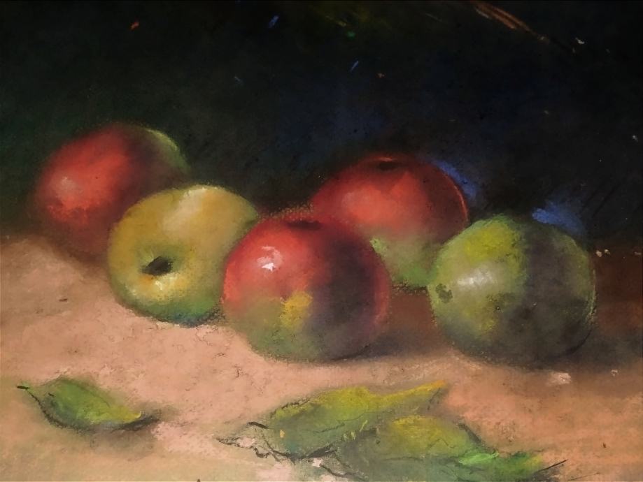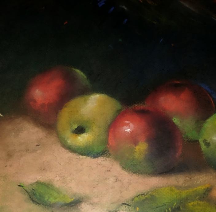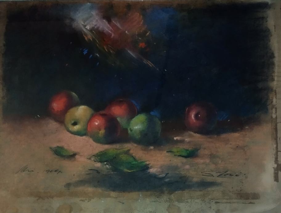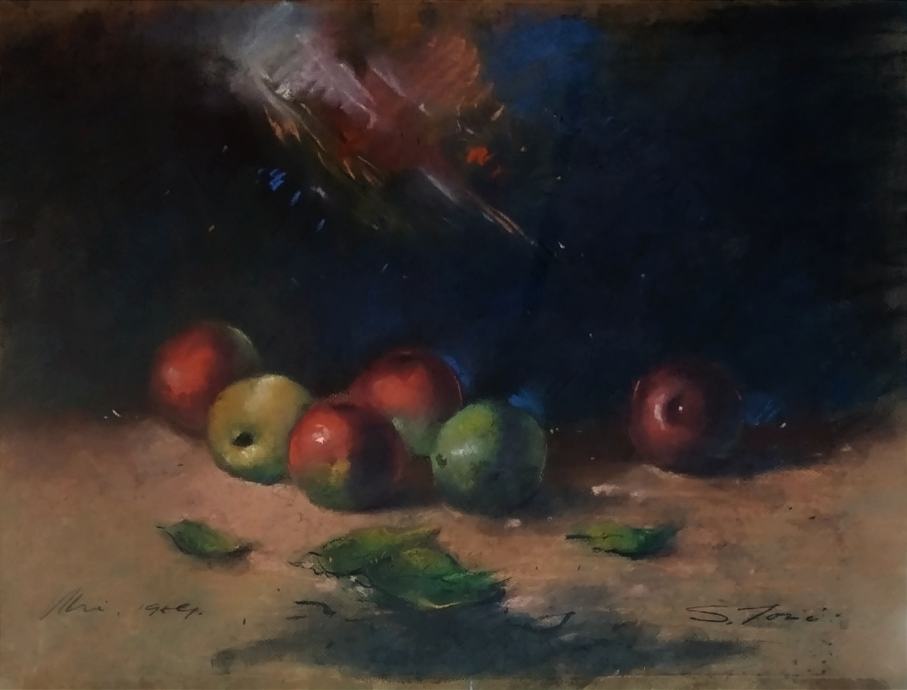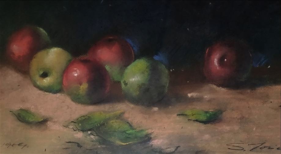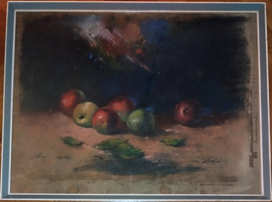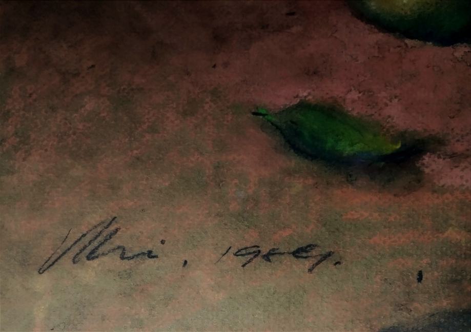 Pastel na papiru iz 1989. Mrtva priroda s jabukama. Uramljeno. Nekoliko manje vidljivih oštećenja na papiru prikazano na fotografijama. Dimenzije 68/52cm.