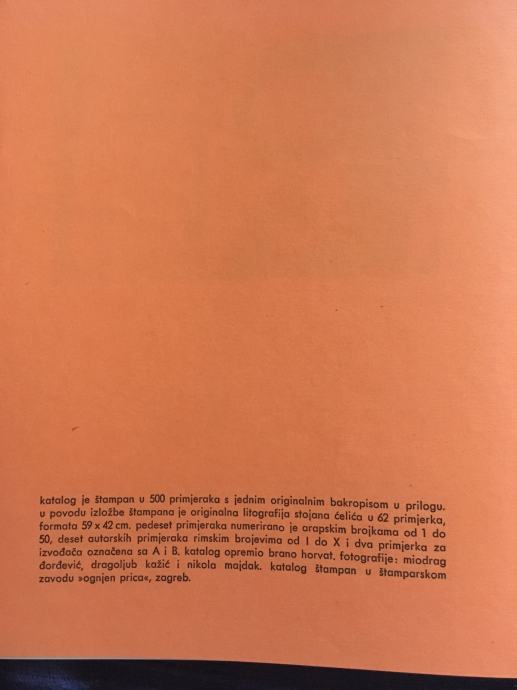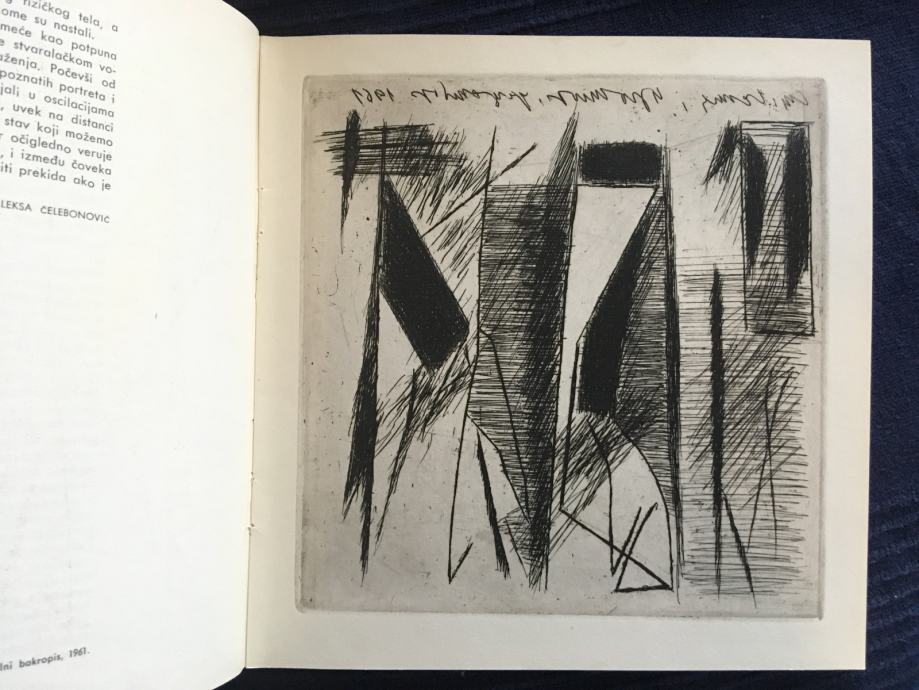 Nepotpisani originalni bakrotisak poznatog srpskog akademskog slikara Stojana Čelića, koji je bio dio kataloga izložbe održane u Galeriji suvremene umjetnosti u Zagrebu, 1962.g. Katalog je izdan u 500 primjeraka (tiskan u Grafičkom zavodu Hrvatske), a bakrotisak je rađen u čuvenom studiju Brane Horvata, u kojemu su svoje grafike radili gotovo svi najznačajniji hrvatski umjetnici druge polovice 20. stoljeća. Dimenzije serigrafije su cca 21x20cm.