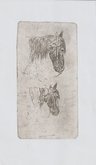 Originalna grafika s prikazom dviju studija konjske glave, postavljenih u vertikalnoj kompoziciji. Rad je izveden u finoj linearnoj tehnici (bakropis ili suha igla), s izraženim, živim potezom i vidljivim tragom ploče uz rubove.