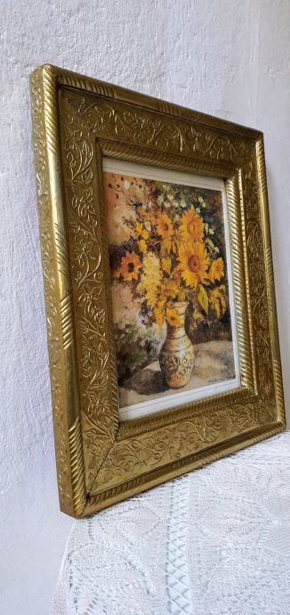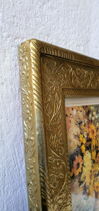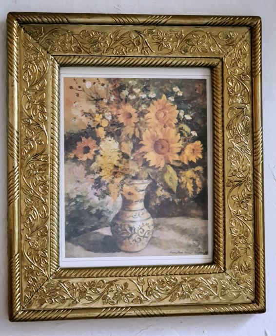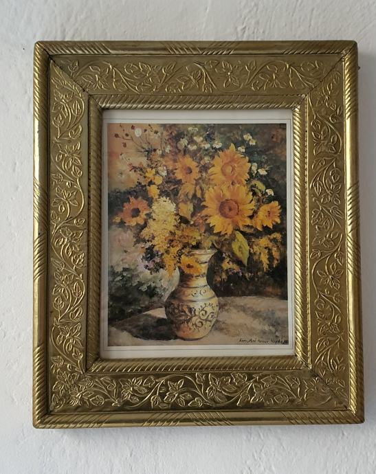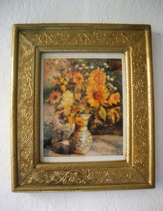 Predivna vintahe stara fotografija sa motivom suncokreta uokviena u predivnom ručno izradenom pozlaćenom mesinganom okviru sa motibom cvijeća rucno prešano limasto ugrađeno na masivno tvrdo drvo