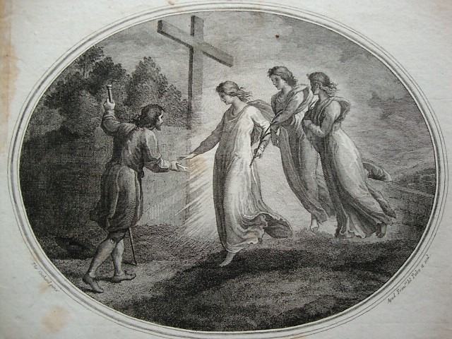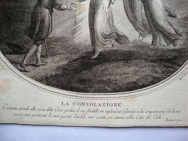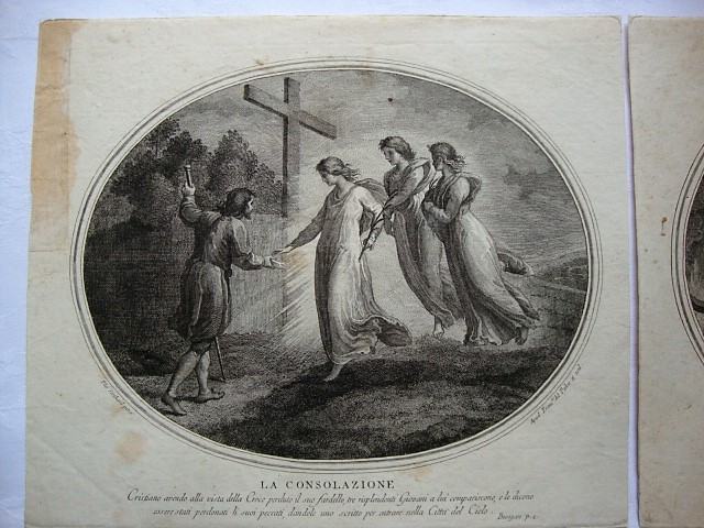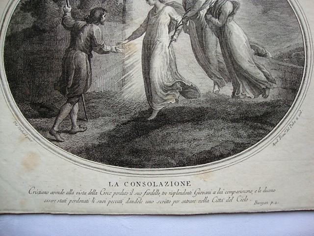LA CONSOLAZIONE - Utjeha (Cristiano avendo alla vista della Croce perduto is suo fardello,tre risplendenti Giovani a lui compariscono e le dicono essere stati perdonati li suoi peccati ,dandole uno scritto per nella Citta del Cielo