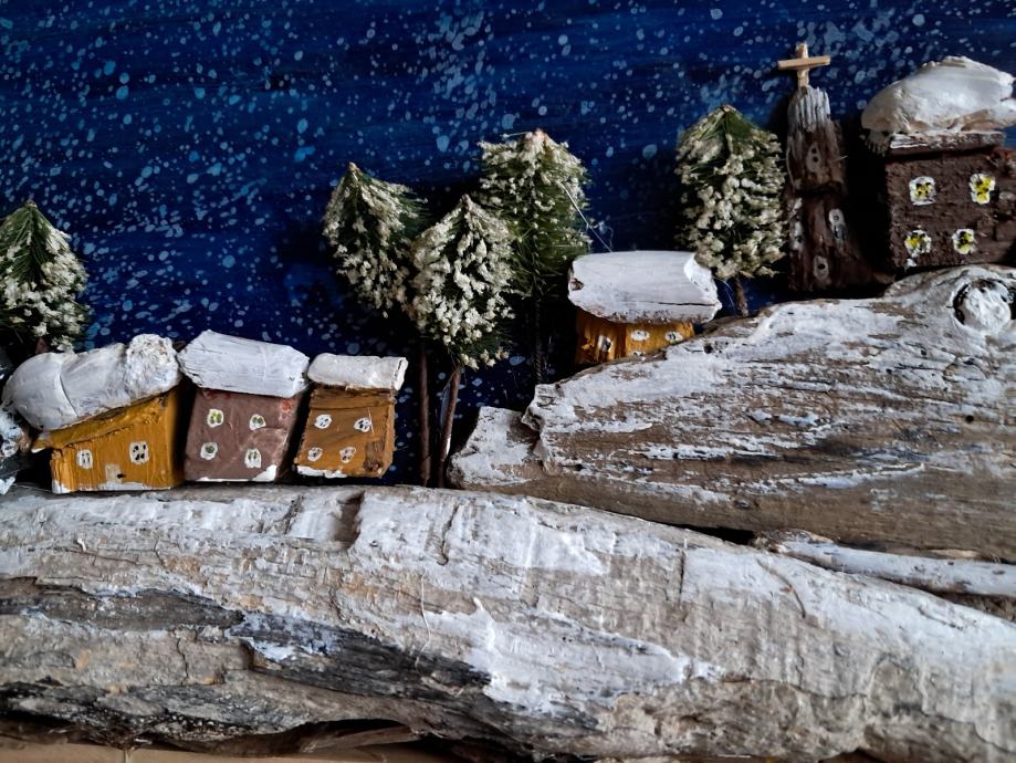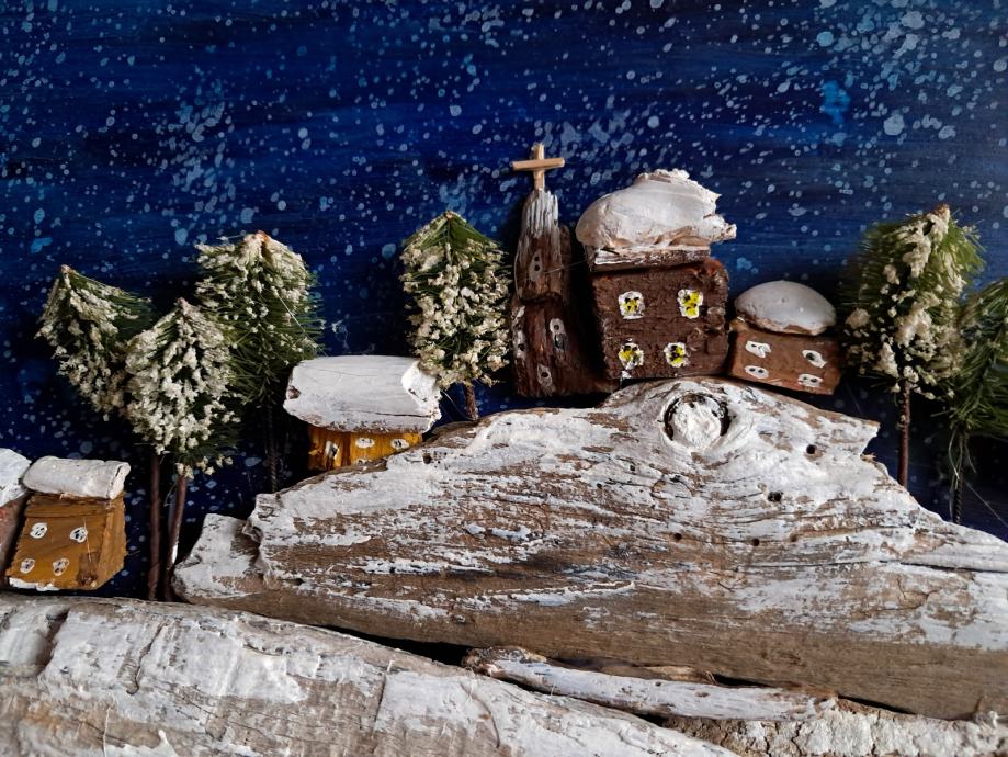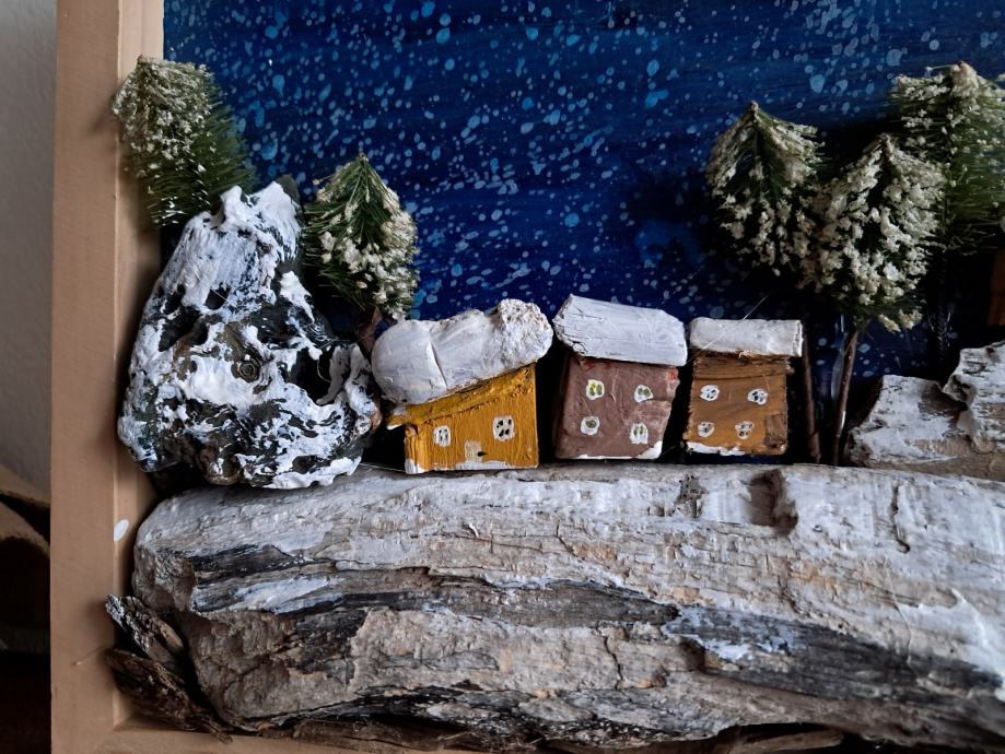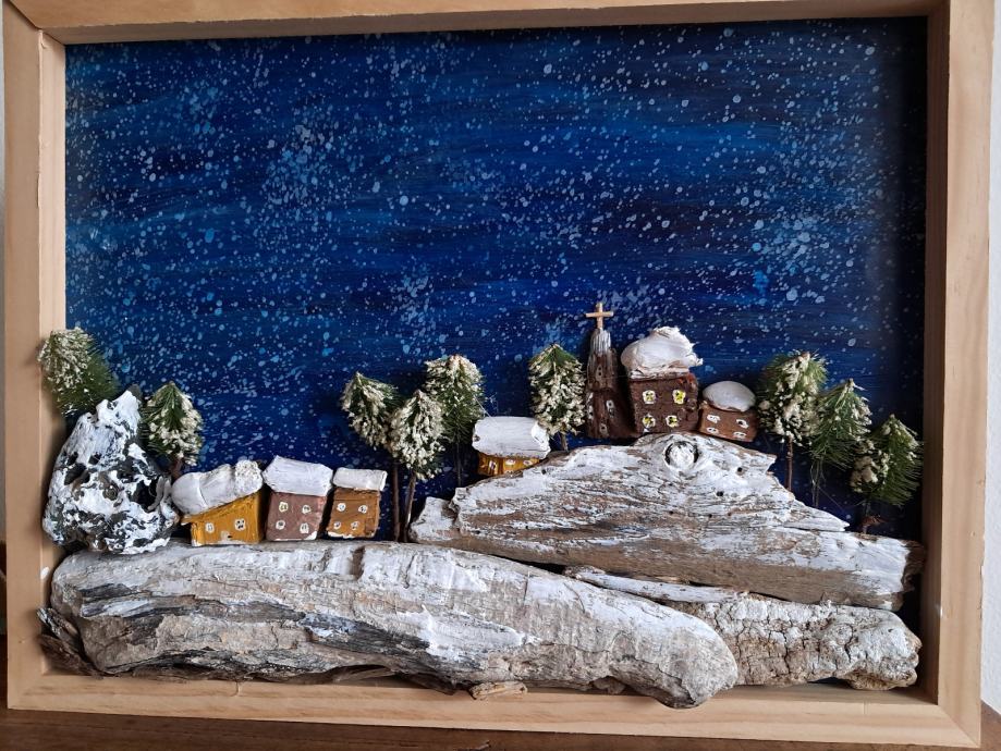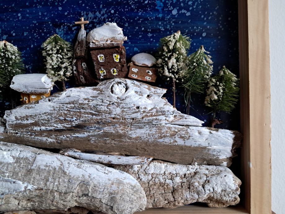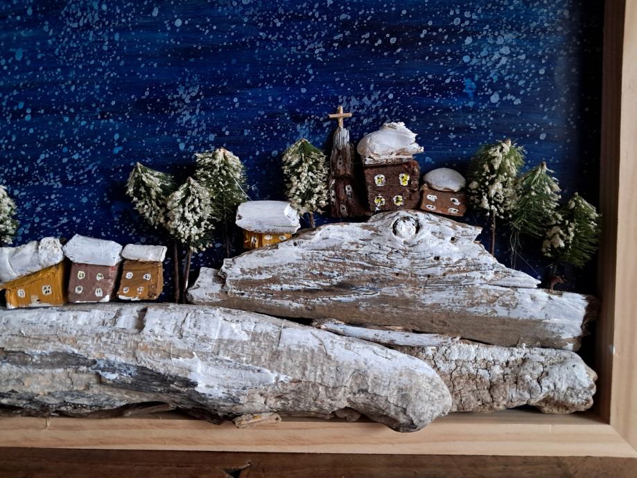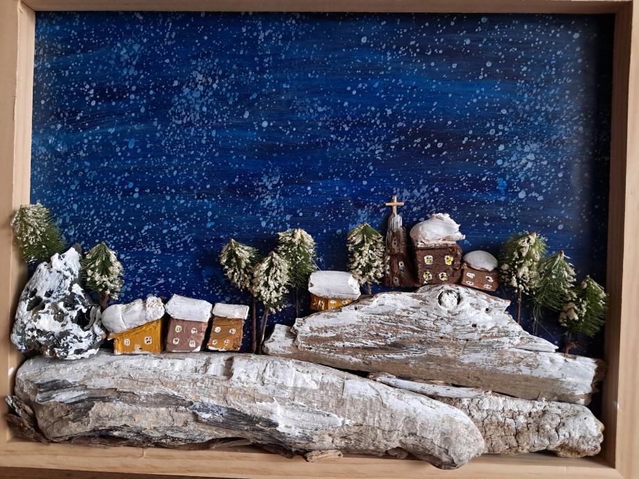 Ova lijepa zimska slika izrađena je od morskih naplavina.Gledajući je, zamišljamo da smo u jednoj od kućica pod snijegom i gledamo pahulje kako padaju.Dimenzija slike je 42 × 32 cm.
