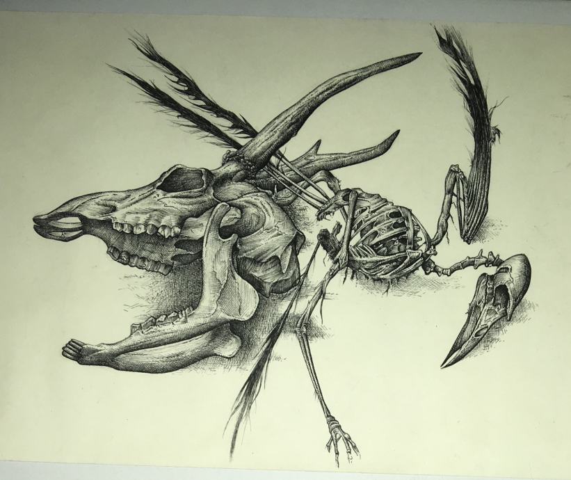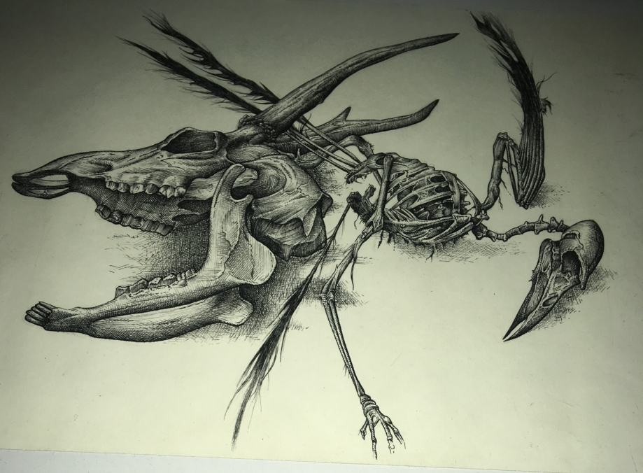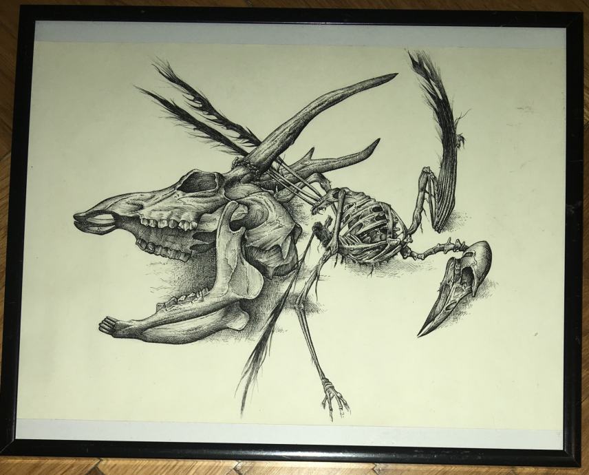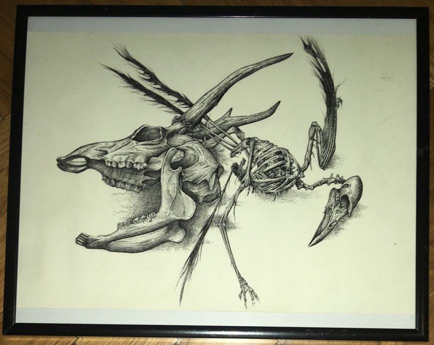 Izvrstan crteš tušem poznatog hrvatskog akademskog kipara i slikara Tomislava Ostoje. Motiv je kostur ptice i lubanja srndaća. Nije potpisano. Uramljeno i ostakljeno. Dimenzije s okvirom 30x25cm.