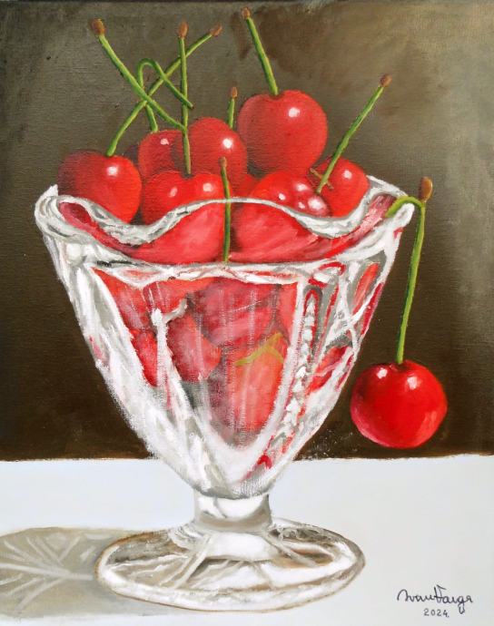 Naslov: "Trešnje";. Originalna vlastita umjetnička slika u tehnici ulje na platnu. Dimenzije: 50x40 cm. Informacije preko e-maila: ivan.varga333@gmail.com ili na mobitel: 091 916 1725. Poštarinu plaća kupac.