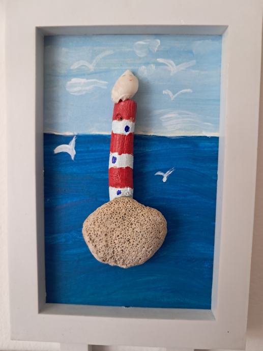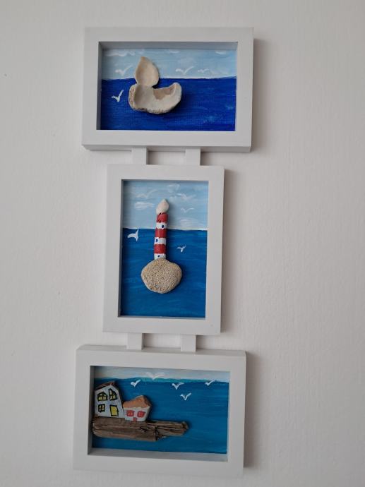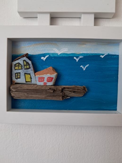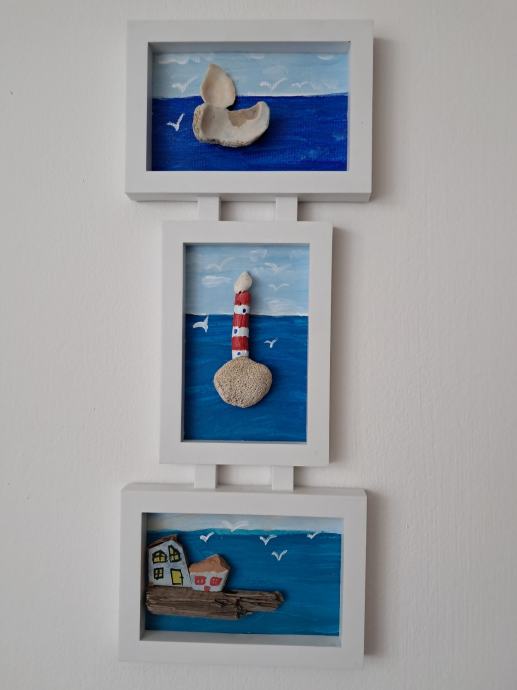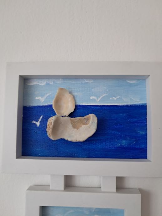 Ove lijepe slike izrađene su od jedinstvenih komada naplavina, morskih školjaka i obojane su akrilnim bojama.Zajedno nas odvode na morske vizure uz koje poželimo biti.Dimenzija slike je 44 × 17 cm.