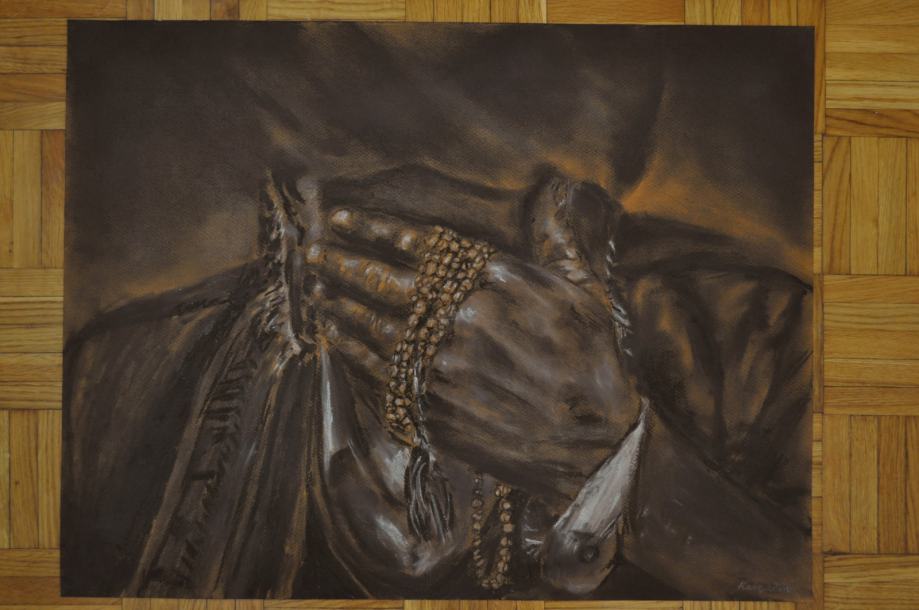 Prodajem umjetničku sliku ugljen na papiru - starac s krunicom.