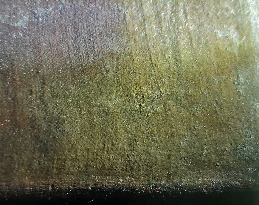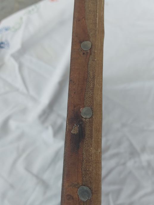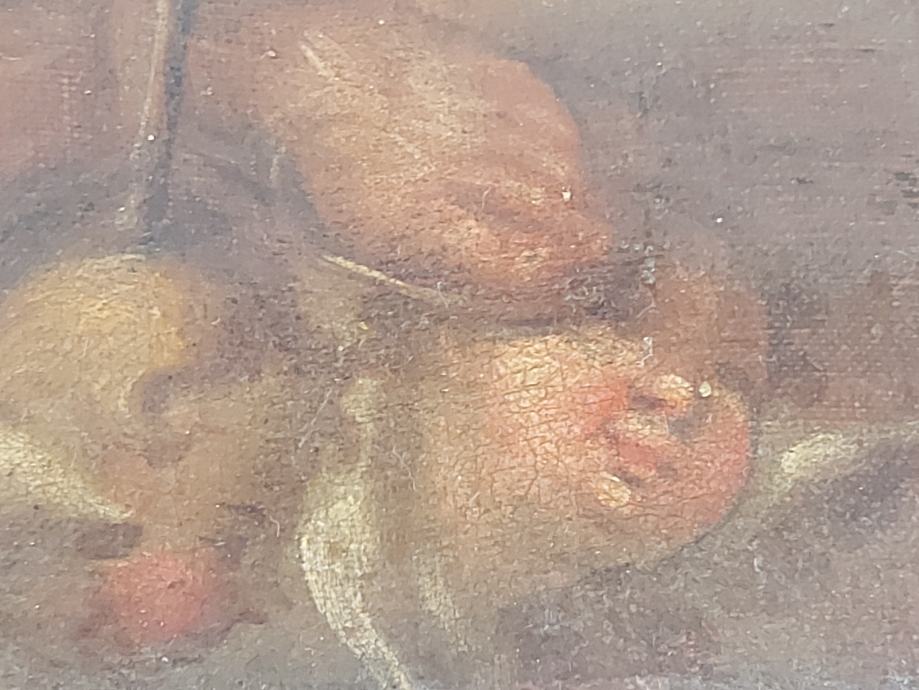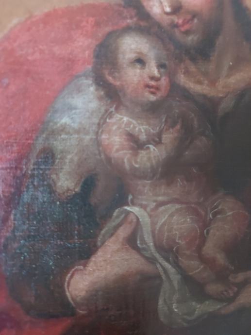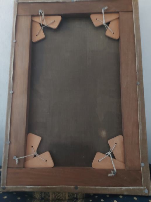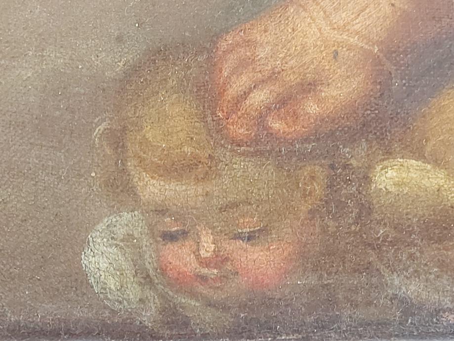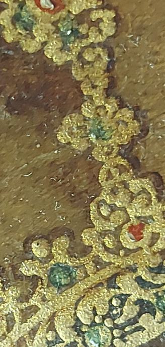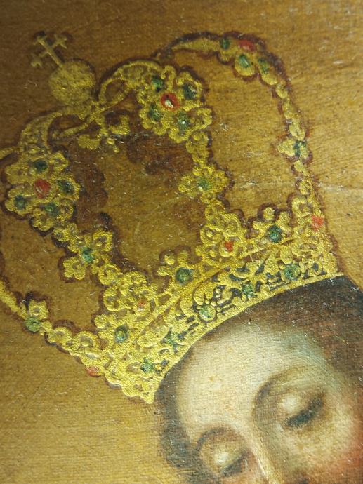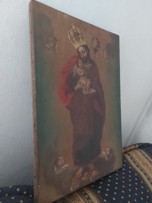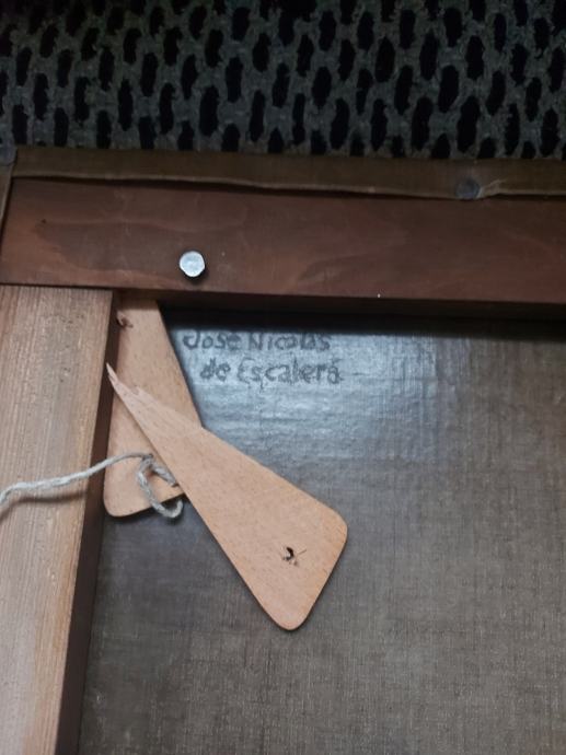 Ulje na platnu sa zlatnim lističima.18 stoljece.Vjerovatno južna amerika iza na platnu ima natpis : Jose Nicolas de Escalera i 1762.Dimenzija 50 x 34 cm.Slika je nekad bila I restaurirata što se vidi po starom platnu navucenom preko novog radi zaštite I ocuvanja.Moze zamjena za stare rucne satove
