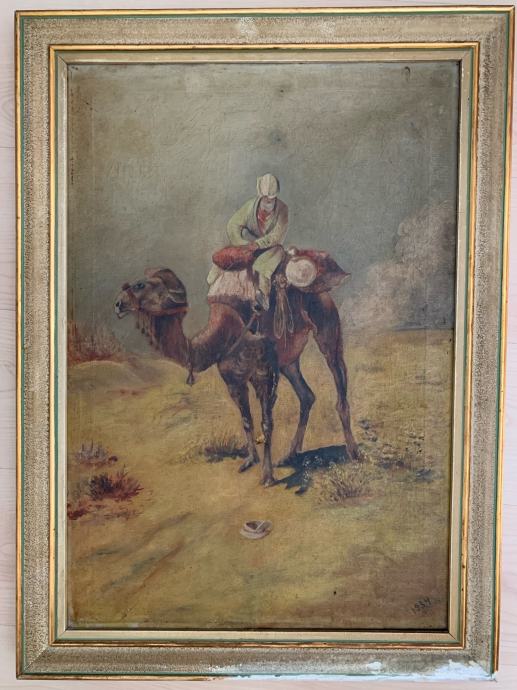 Jedna od najinteresantnijih umjetnina koje sam vidio, s arapskim motivom deva/pustinja iz 1934. godine. Slika ima bogatu povijest iza sebe, vidljiva su manja ostecenja i ispucalost ali potrebno ju je bolje istraziti, mogla bi vrijediti citavo bogatstvo! Molim samo ozbiljne zainteresirane kolekcionare, za cijenu se mozemo dogovoriti!