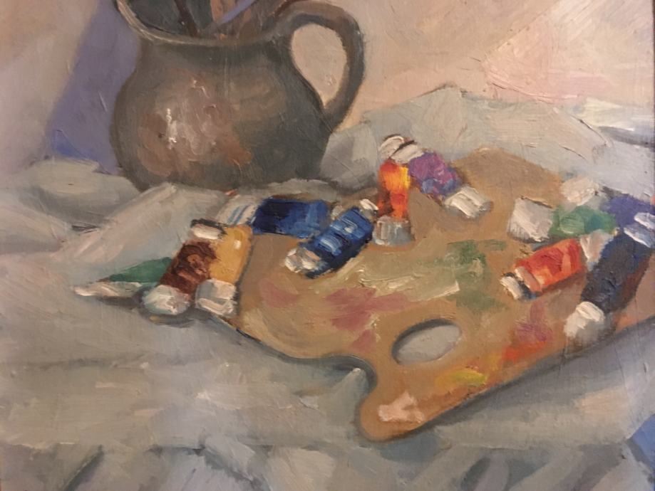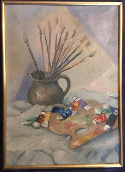 Izvrsno ulje na platnu meni nepoznatog autora (nije potpisano). Motiv je mrtva priroda s kistovima i bojama, dimenzije s okvirom 48x34cm.