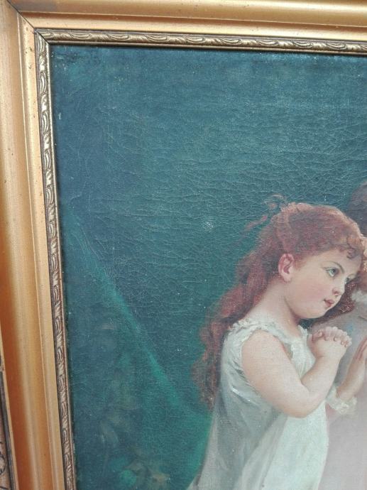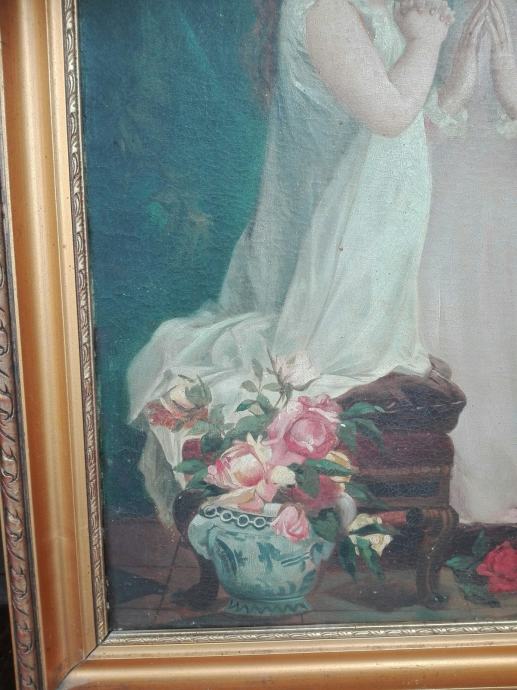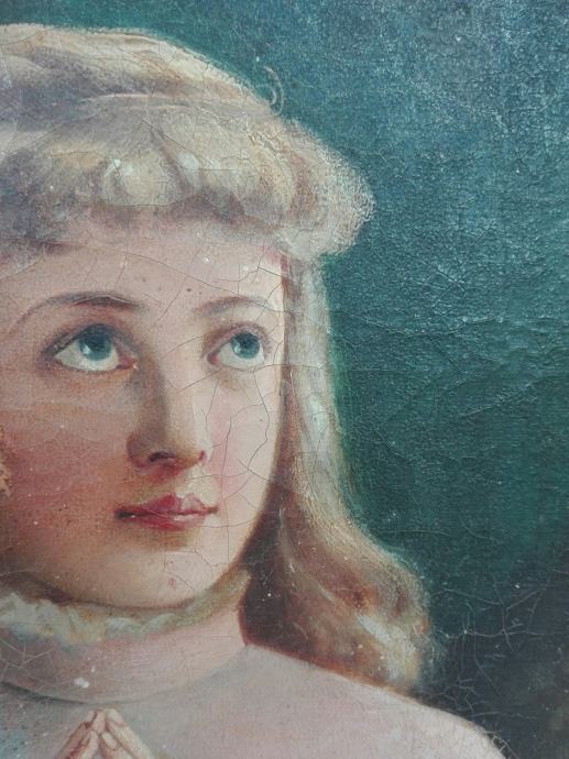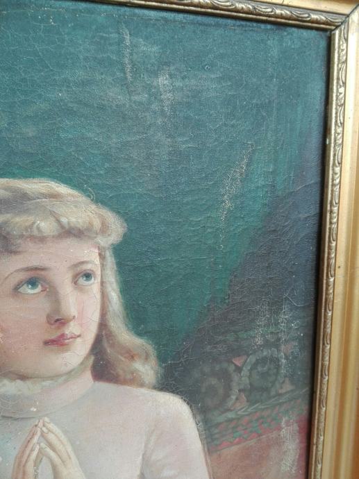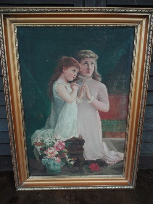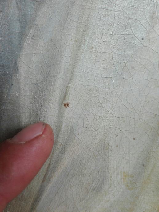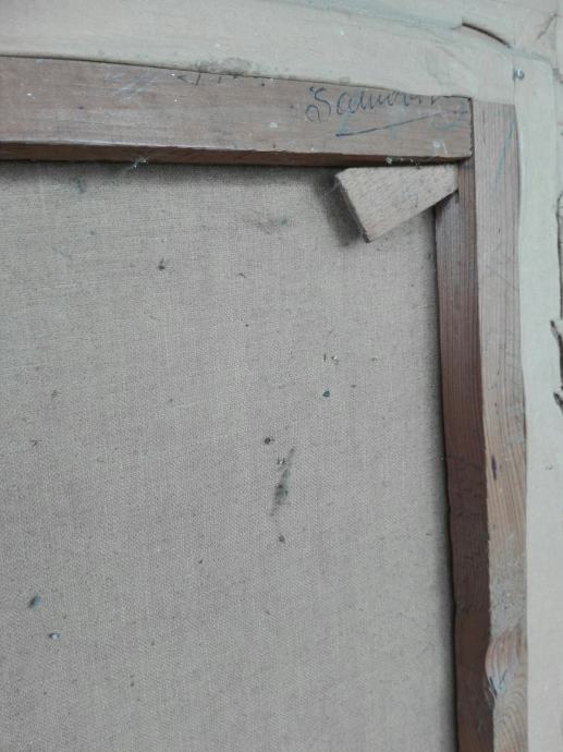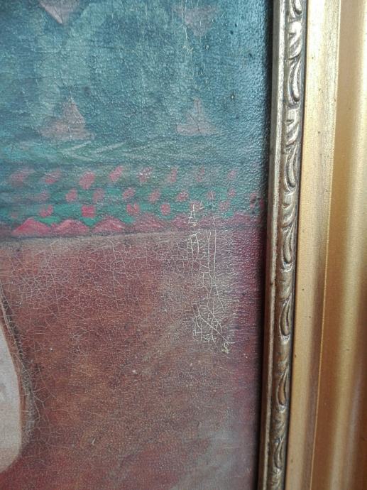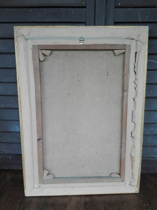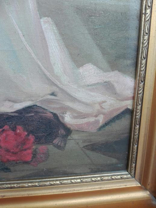 Slika ulje na platnu. Dimenzije platna na okviru 42,5 x 63cm. Ima ponekih oštećenja koje sam se potrudio pofotkati pa ih možete vidjeti na fotkama. Ukupno stanje slike je veoma dobro i boje nisu izblijedile. Nemogu pronaći mjesto gdje je potpis autora. Slika je kod mene već 50 godina, ne znam ništa o prijašnjem životu ove slike. Na sms nemogu odgovoriti, najbolje bi bilo da me nazovete 099 687 5657 ili pošaljete poruku preko Njuškala. Navedena cijena je prava cijena!