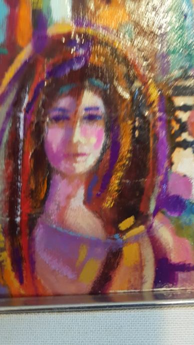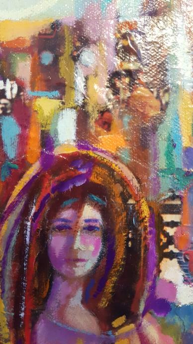 Apstraktna slika,koja prikazuje ženski portret sa živopisnom,šarenom pozadinom urbanog grada.Obogacena bogatim,toplim bojama.