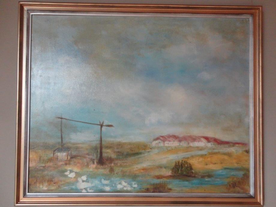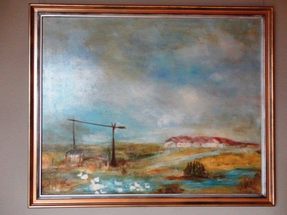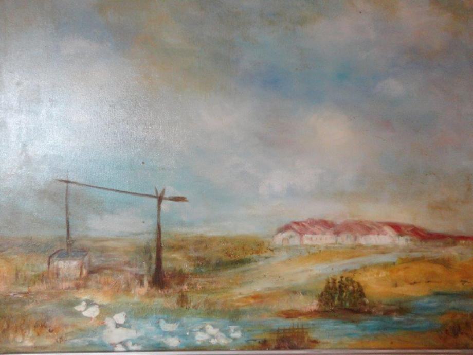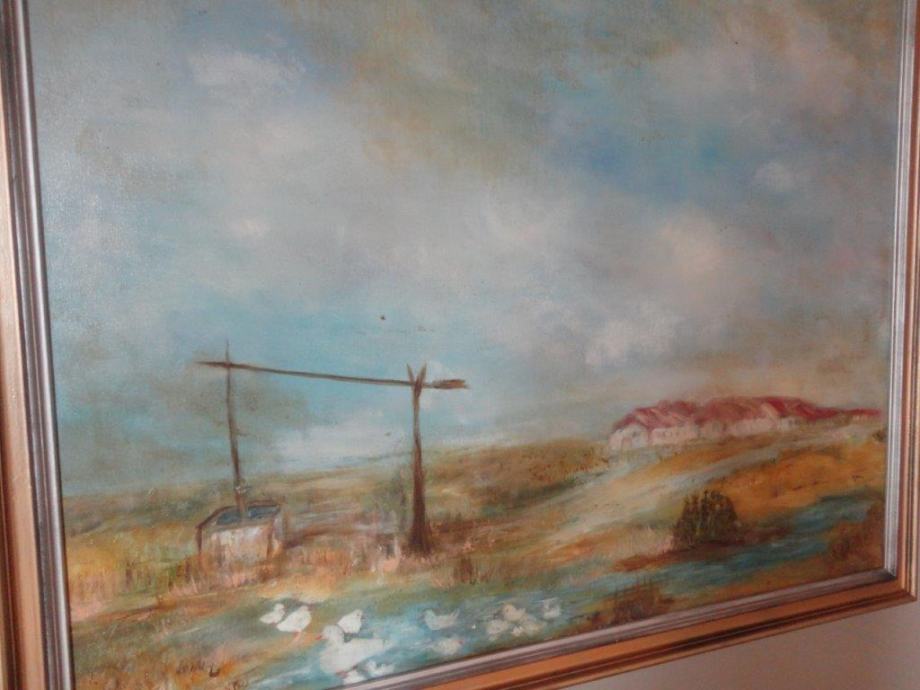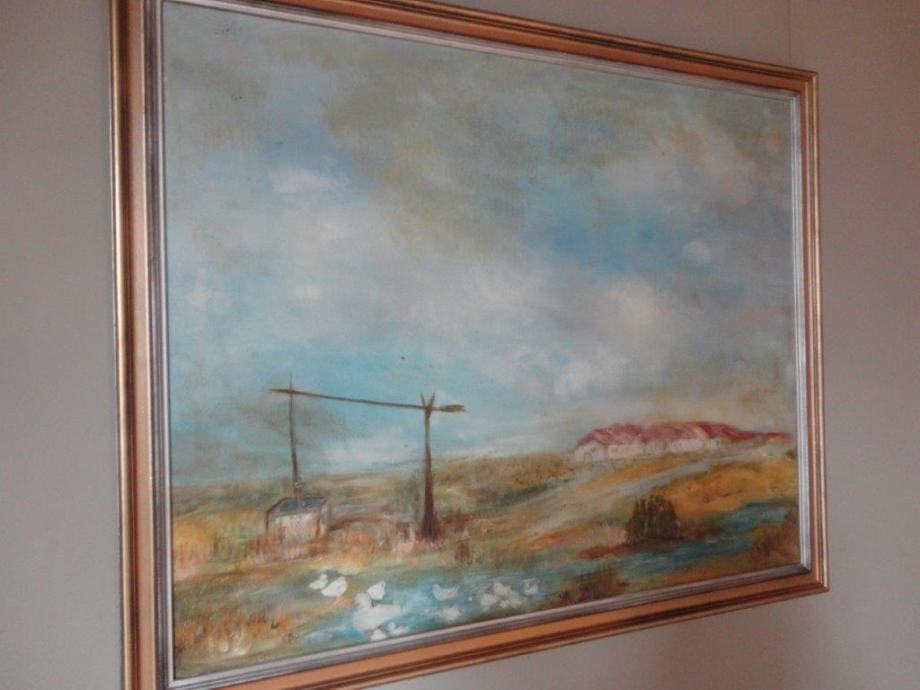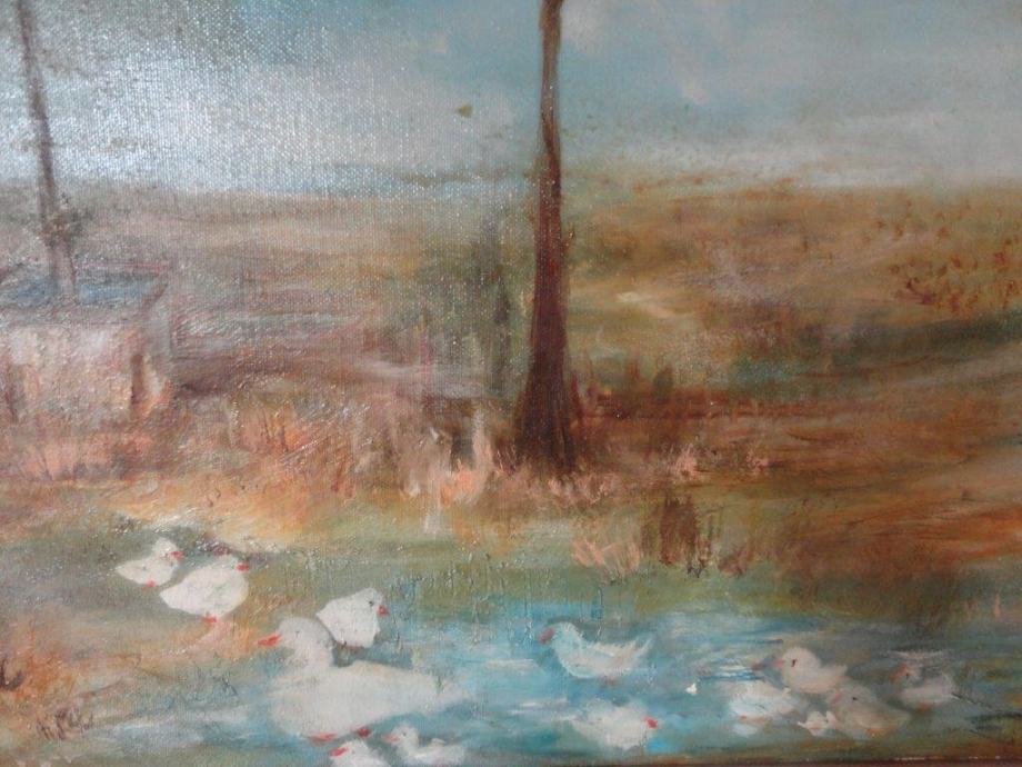 Veliko ulje na platnu, seoski pejzaž sa jezerom i patkama