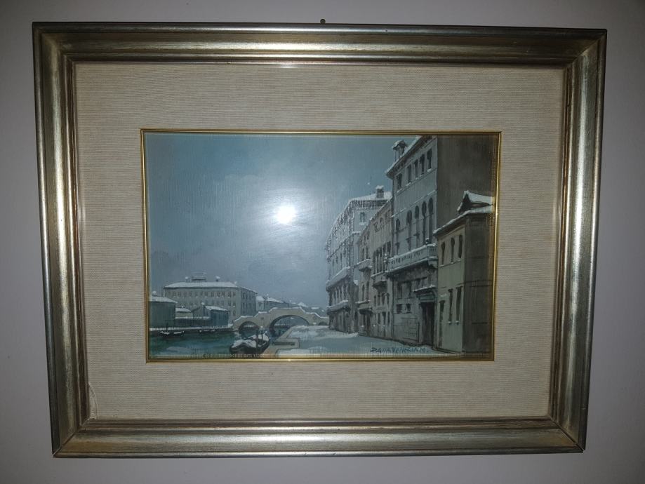 Staro ulje na platnu Venecija pod snijegom iz 1946. g. Potpisana, na polođini ima posvetu.