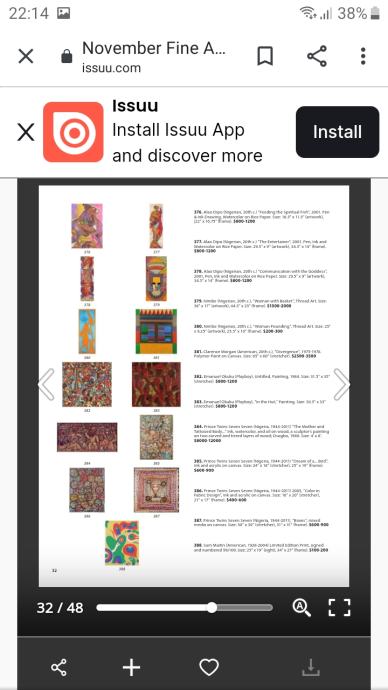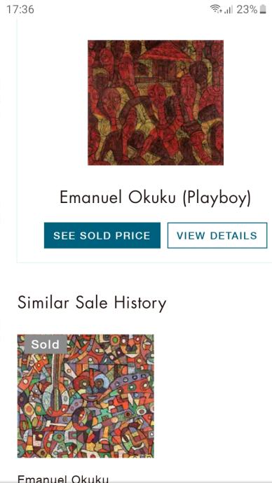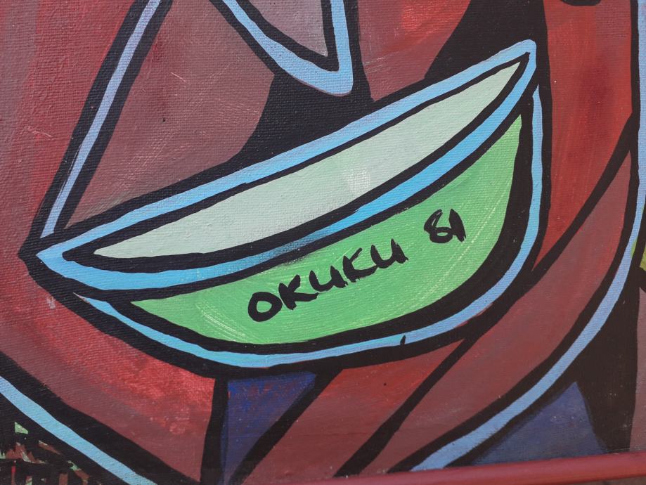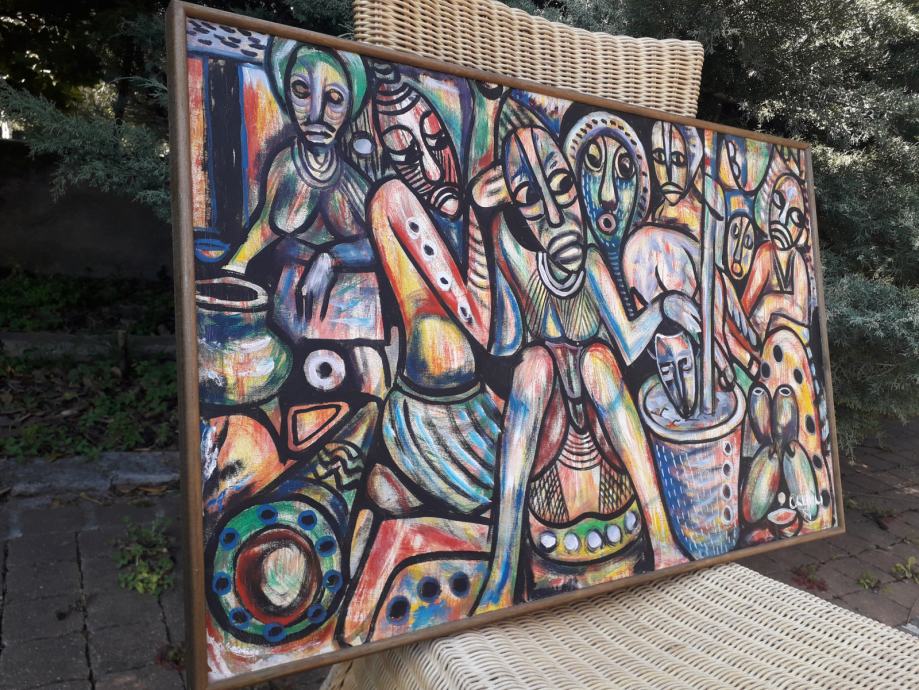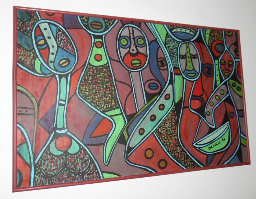 Dva ulja na platnu nigerijskog slikara Emmanuela Okuka. Emmanuel Okuku je predstavnik tzv. primitivne umjetnosti kao ishodišta suvremene umjetnosti. Slike se savršeno uklapaju kako u suvremene tako i u klasične interijere. Cijena svake slike pojedinačno iznosi 2900 kuna dok je cijena za obe 5300 kuna. Dimenzije slika su 76x48. Stanje je savršeno.