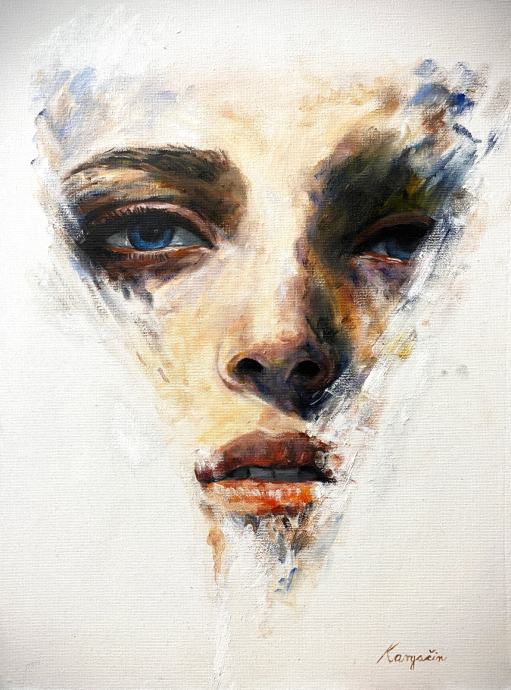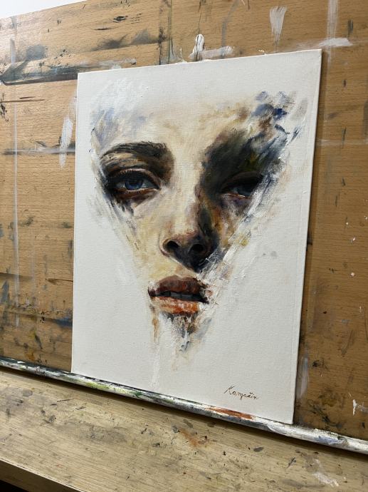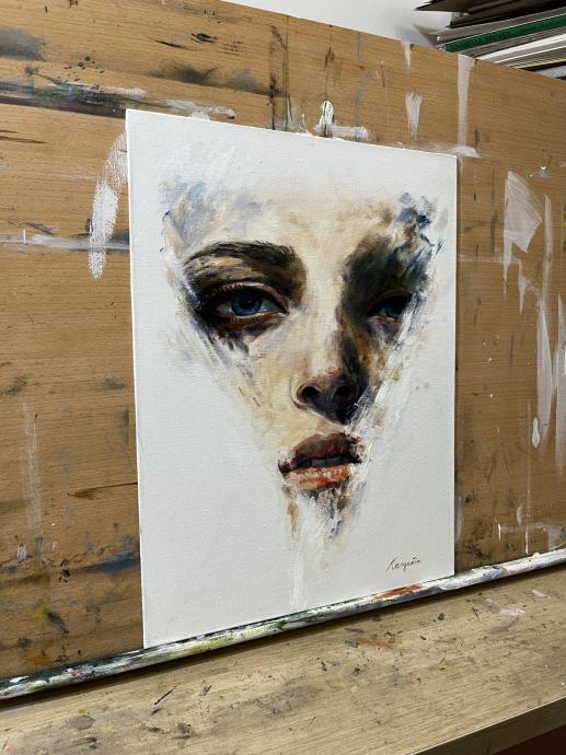 Ulje na platnu, slika žene koja se gubi u bjelini, umjetnina, original