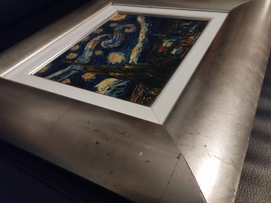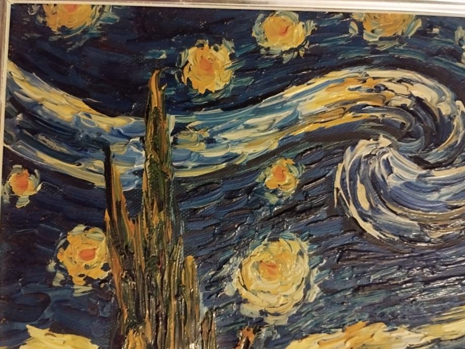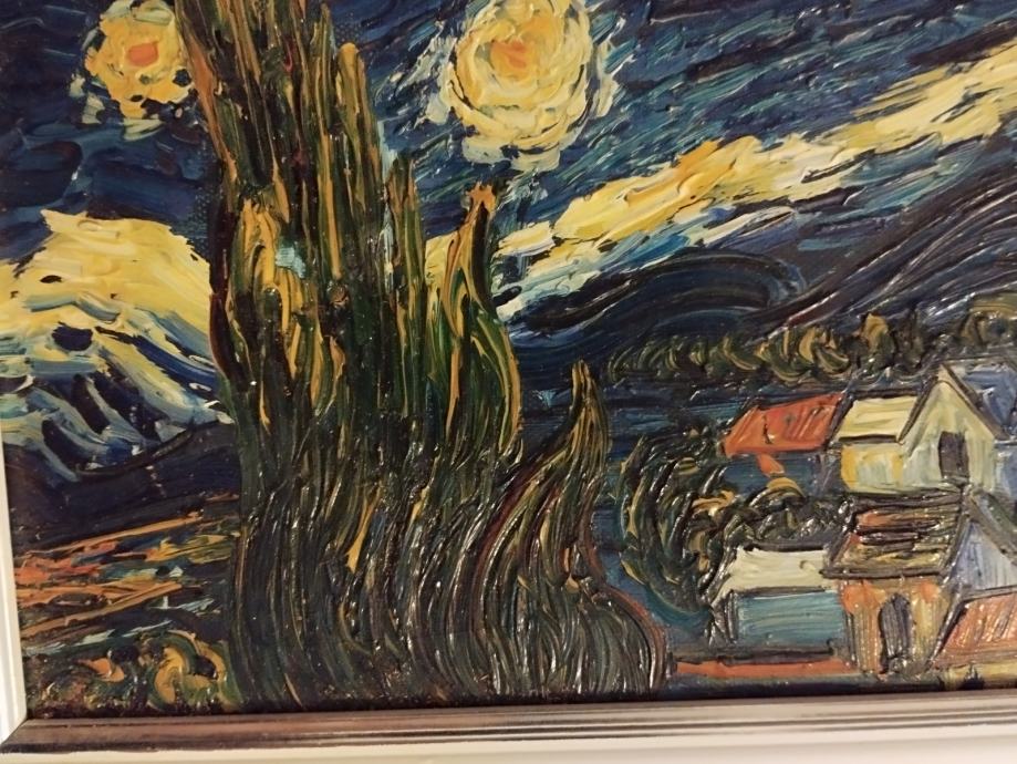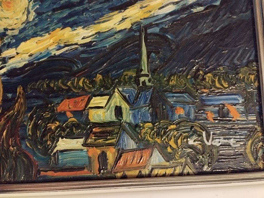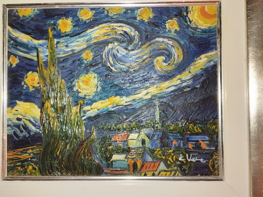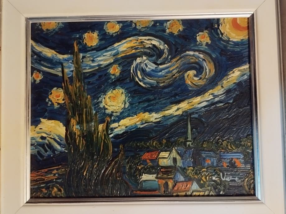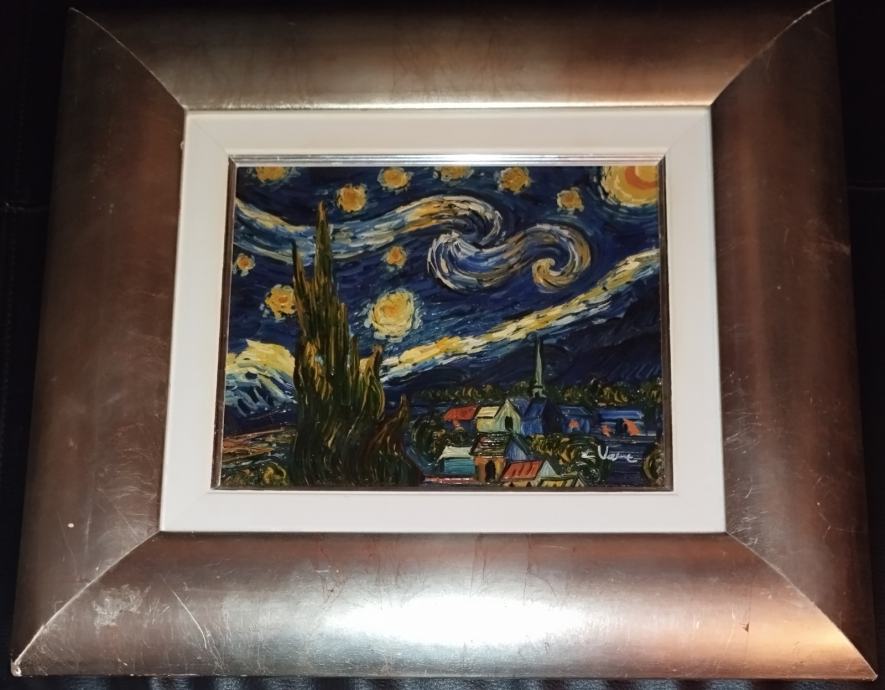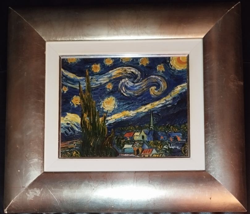 Ulje na platnu izrađeno prema čuvanoj Van Goghovoj slici - Zvjezdana noć. Potpisano, ne mogu odgonetnuti autora. Debeli namazi boje. Luksuzna drvena rama i paspartu. Ukupne dimenzije 47x42cm- Sama slika 26x21cm.
