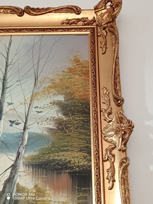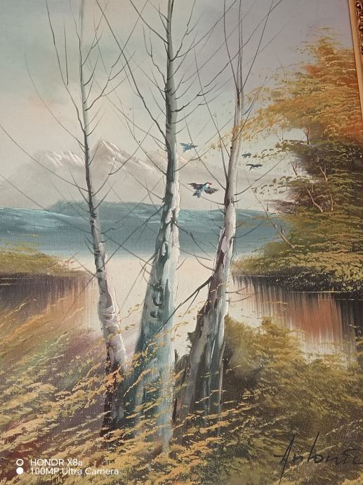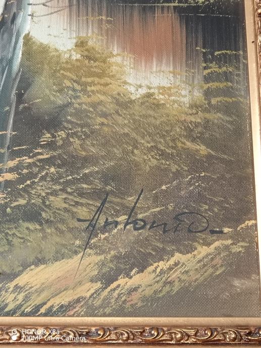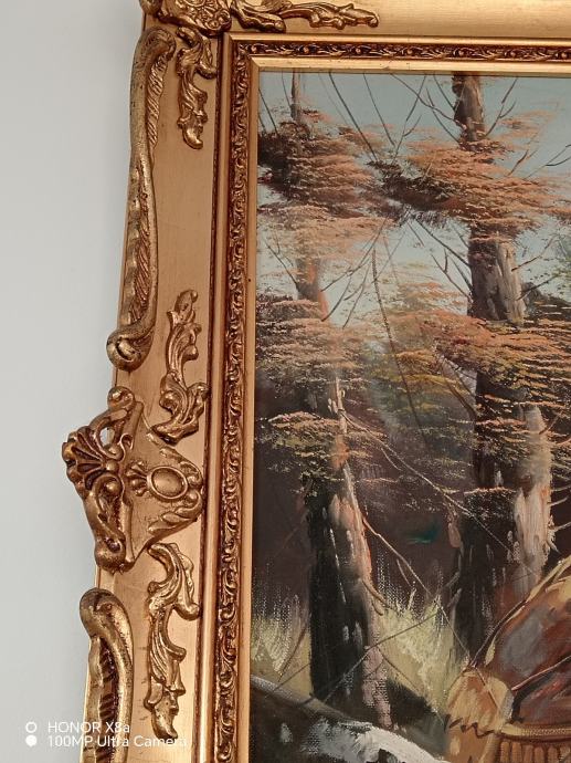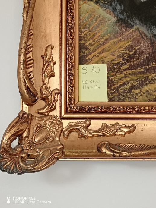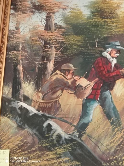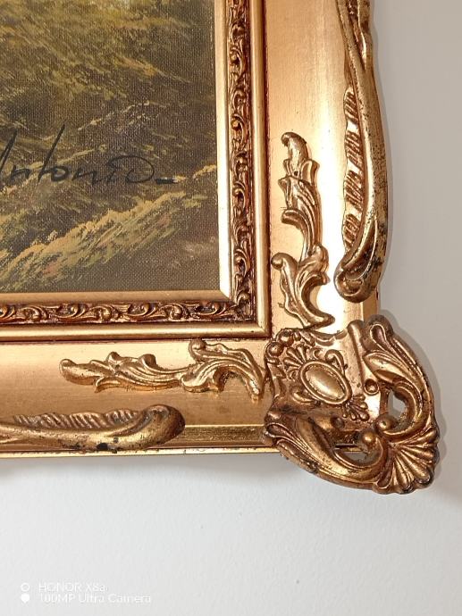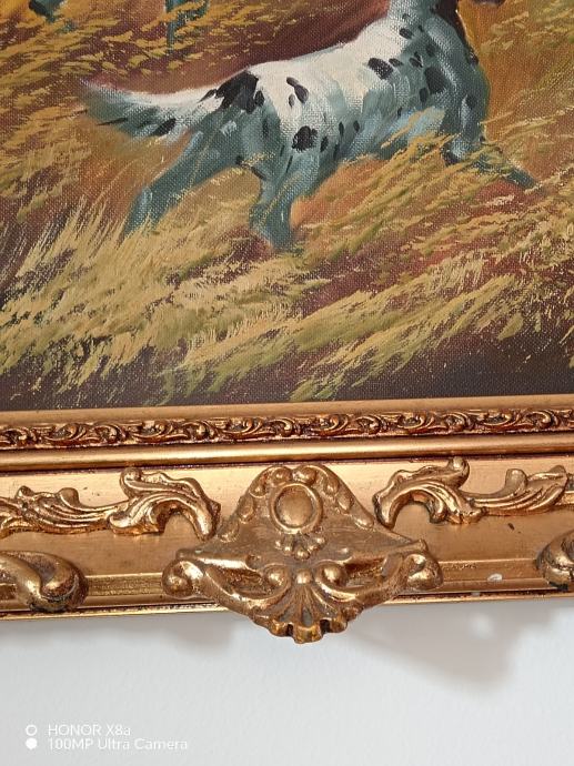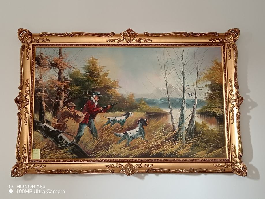 ....Prodaje se dekorativna uljana slika na platnu, s motivom lovačke scene – dvojica lovaca i psi ptičari u jesenskom pejzažu. Slika je potpisana u donjem desnom kutu (Antonis) i uokvirena u bogat barokni pozlaćeni okvir koji dodatno naglašava klasičan ugođaj i toplinu prizora.