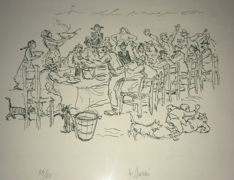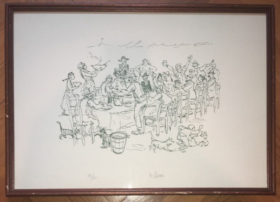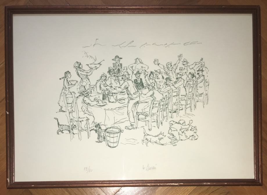 Potpisana i numerirana (59/80) grafika poznatog talijanskog slikara Umberta Sgarzija (Bologna, 1921. - 2017.). Galerijski uokvireno i ostakljeno. Motiv je seoska fešta. Dimenzije s okvirom su 52x37cm. Cijene njegovih grafika su 300-400EUR.