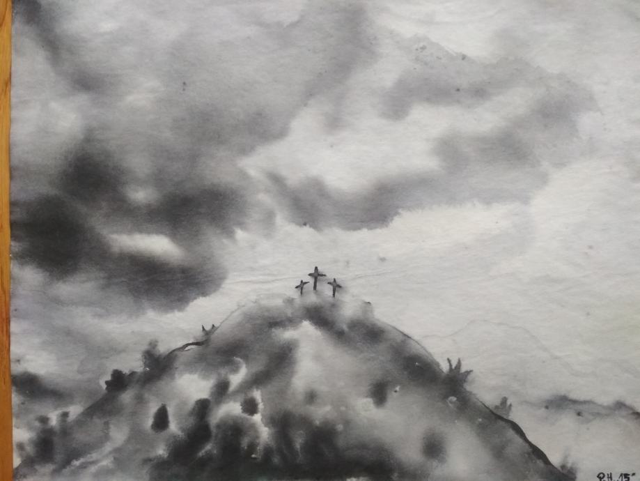 Prodaje se umjetnička slika s prikazom Kalvarije - Golgote, naslikana tušem na papiru. Dimenzije slike su 39cm x 30 cm. Slika nije uramljena.