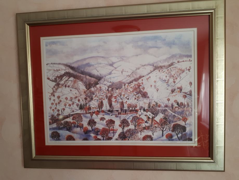 Ovo je original reprodukcija umjetničke slike akademskog slikara Ice Polovića naziva "Čučerje zimi". Veličina slike sa okvirom je 72/91,5 cm. Prekrasan je ukras na zidu, a vrhunski okvir dodatno slici daje profinjenost i ljepotu. Dobra slika ponekad u potpunosti mijenja cjelokupnu unutrašnjost prostorije. Također može biti solidan i samodostatan poklon za svaku prigodu i proslavu koji će pokazati Vaš ukus i zanimanje za slikarstvo. Moguć dogovor oko cijene.
