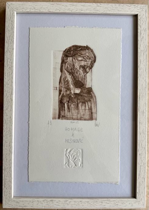 Uokvirena i ustakljena grafika (A.O. - autorski otisak) “Krist / Homage a Meštrović” (dimenzije 27x39 cm) u tehnici suhe igle slikara Branka Modica iz 2022. godine