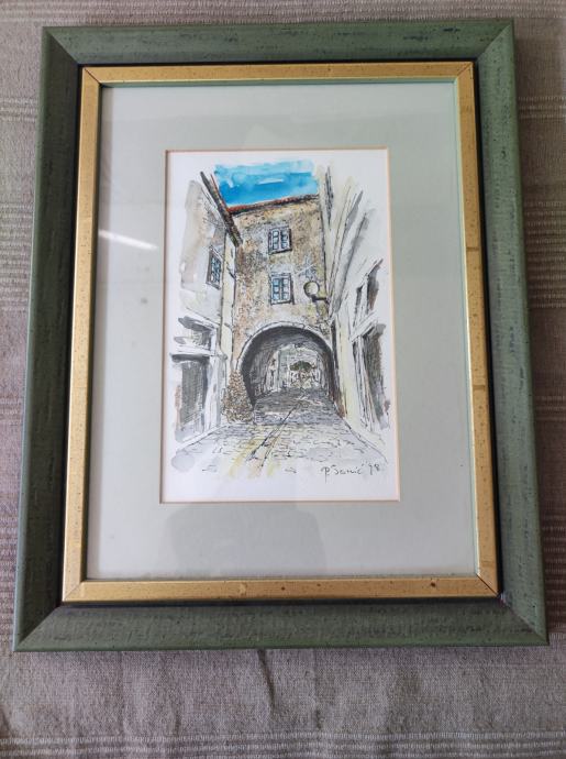 Uokvirena i ostakljena slika, akvarel, dimenzije 32 x 41, motiv vrata u staroj jezgri Raba